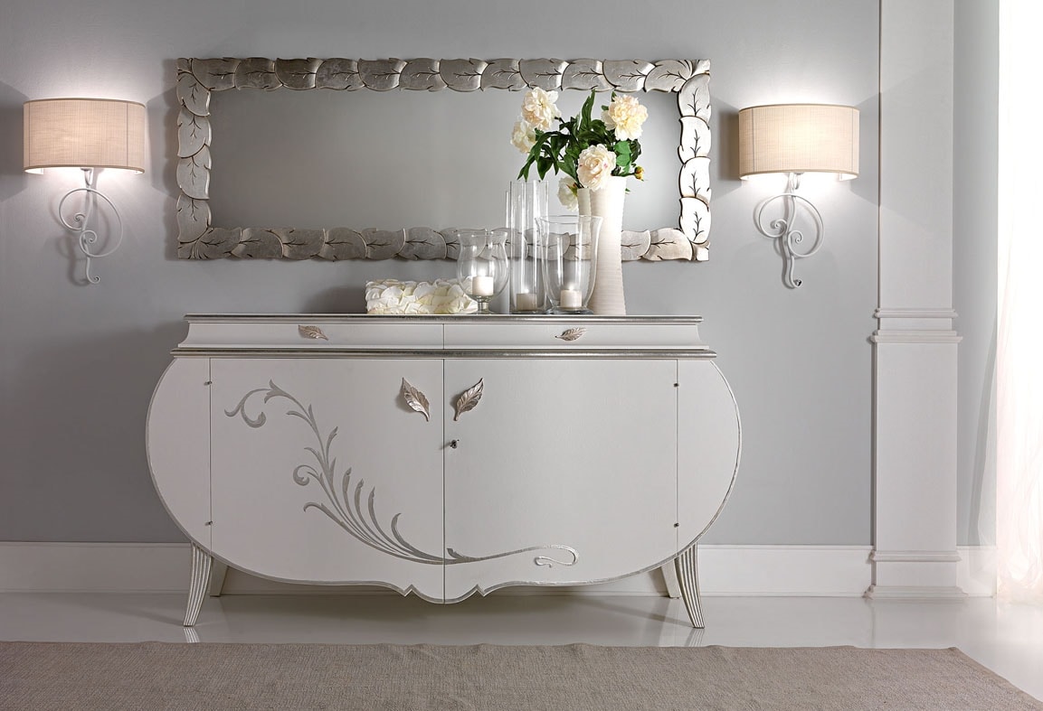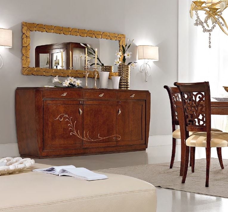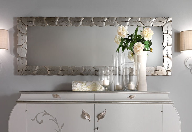 Specchiera rettangolare con cornice intagliata in finitura argento o oro.