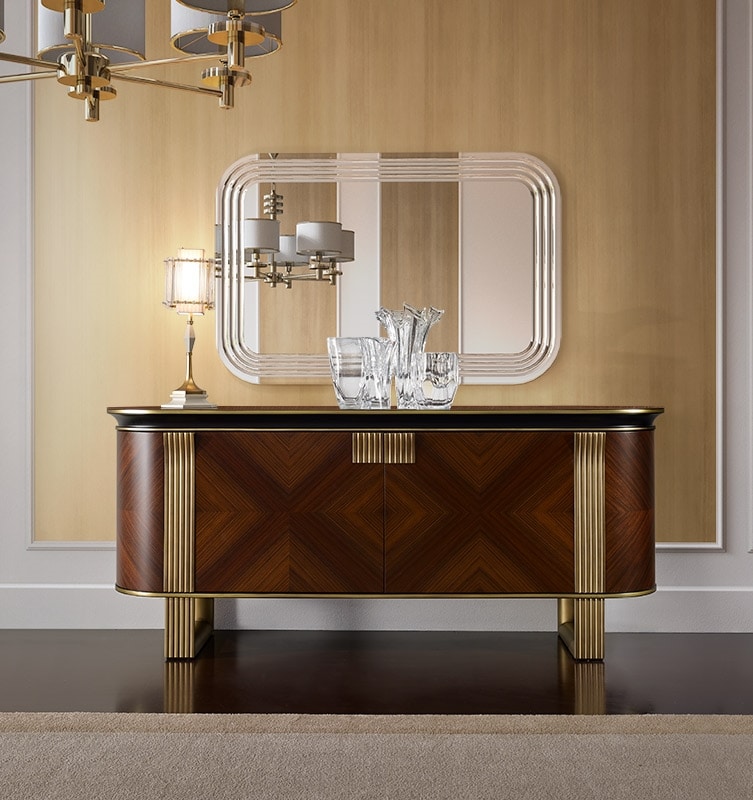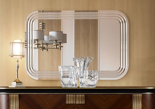 Specchiera con struttura in multistrato ed MDF impiallacciato. Specchio naturale con incisioni raggiate. Essenza frassino fiammato.