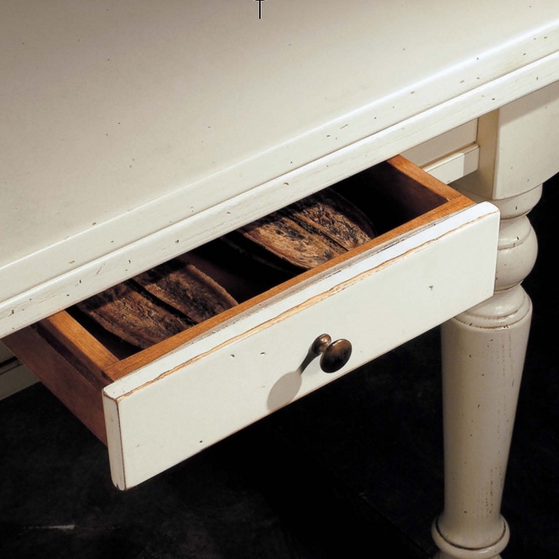Richiedi prezzi Prodotti similiTavolo rettangolare allungabile con allunghe laterali estraibili, detto anche con apertura "a tiro", attrezzato con piano estraibile, mattarello e cassetto. Impiallacciato in legno di frassino e gambe in legno massello di faggio.