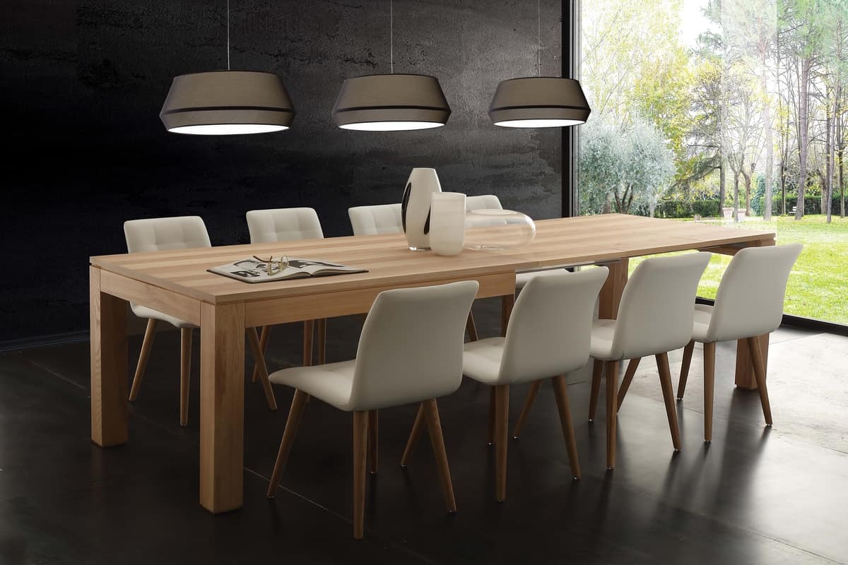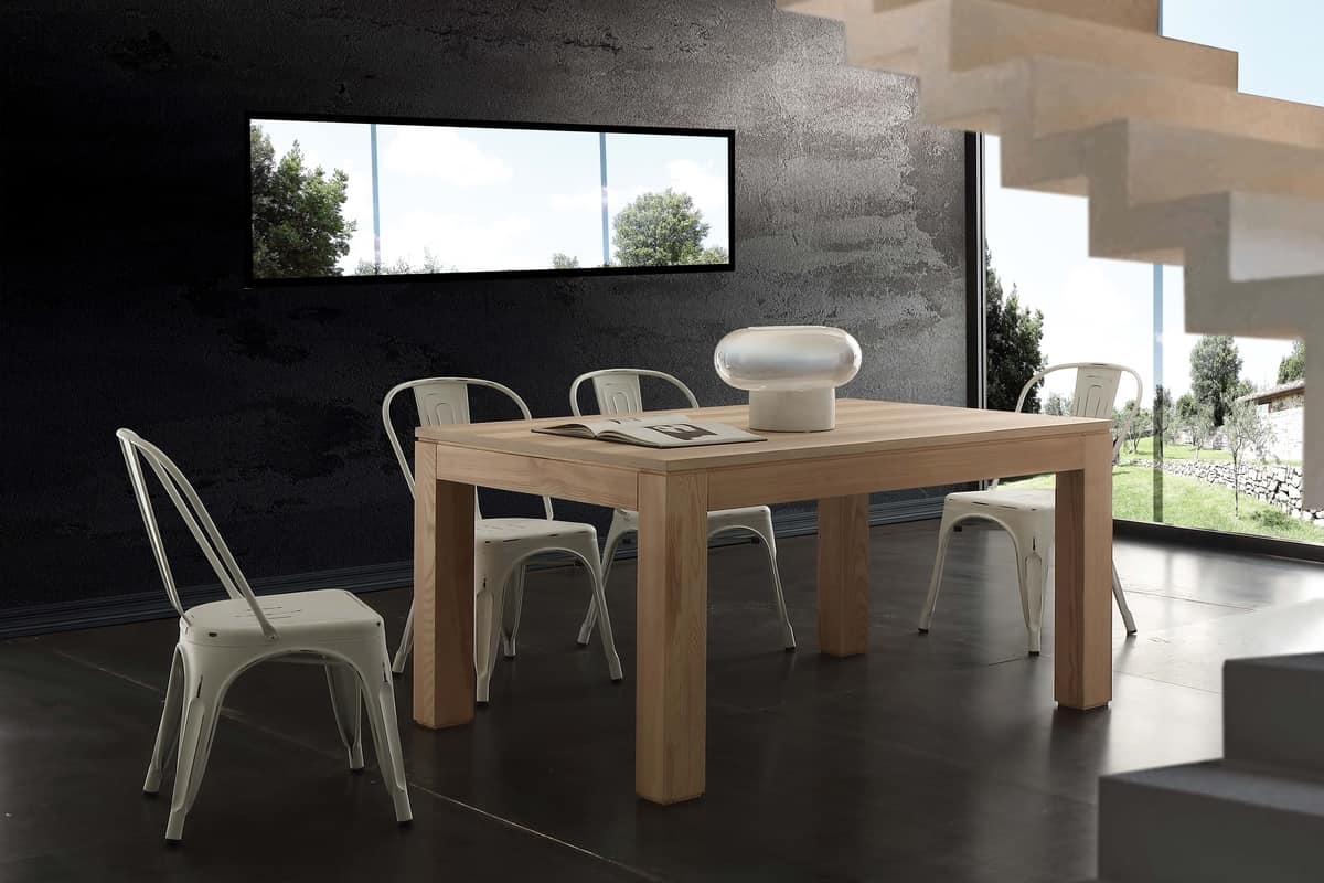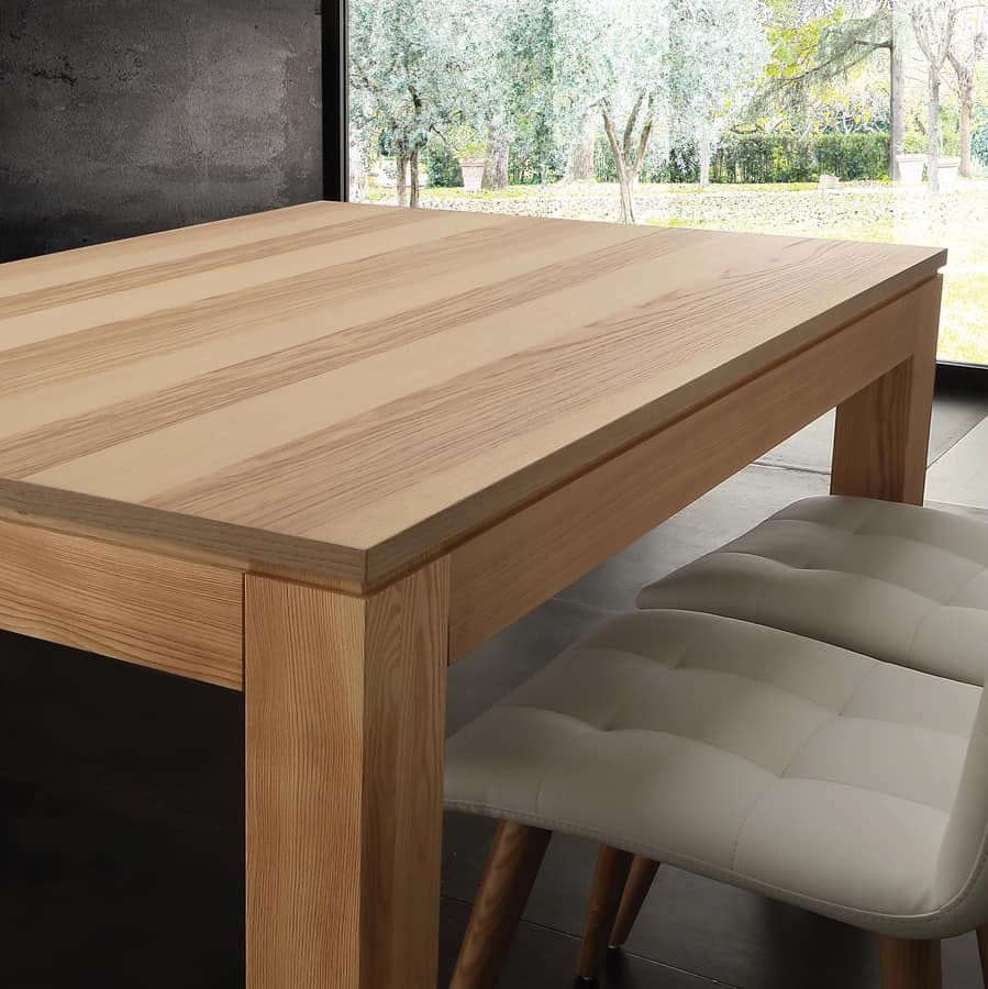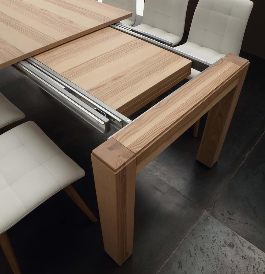 Tavolo telescopico con gambe in massello e piano in listellare impiallacciato. Finitura: frassino olivato tinto naturale. Adatto per sala da pranzo.