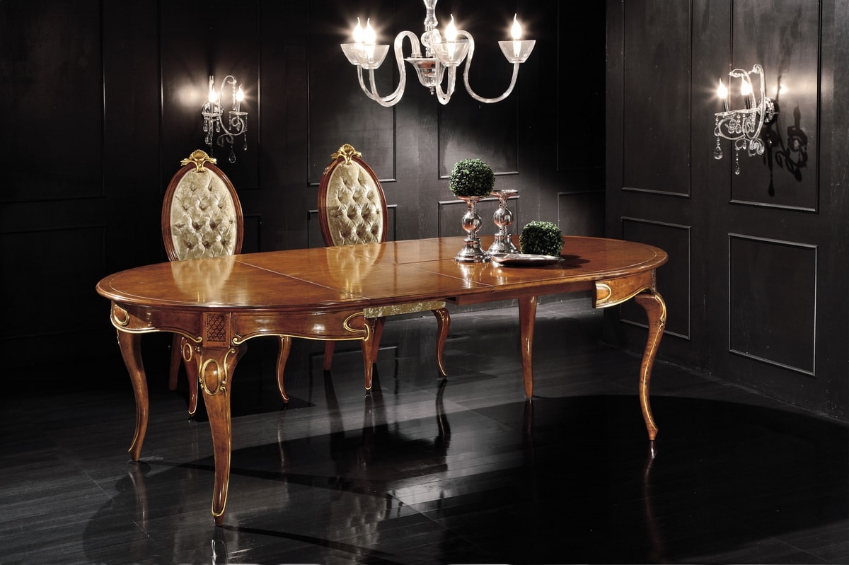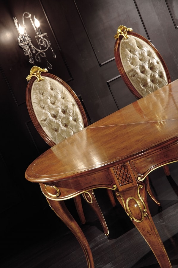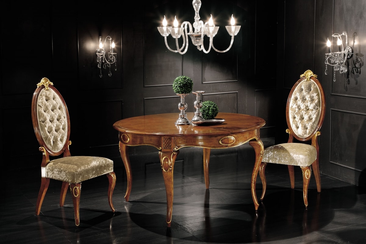 Tavolo tondo allungabile stile classico color noce e foglia oro.