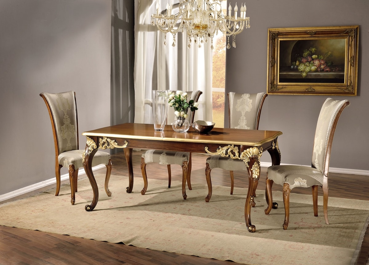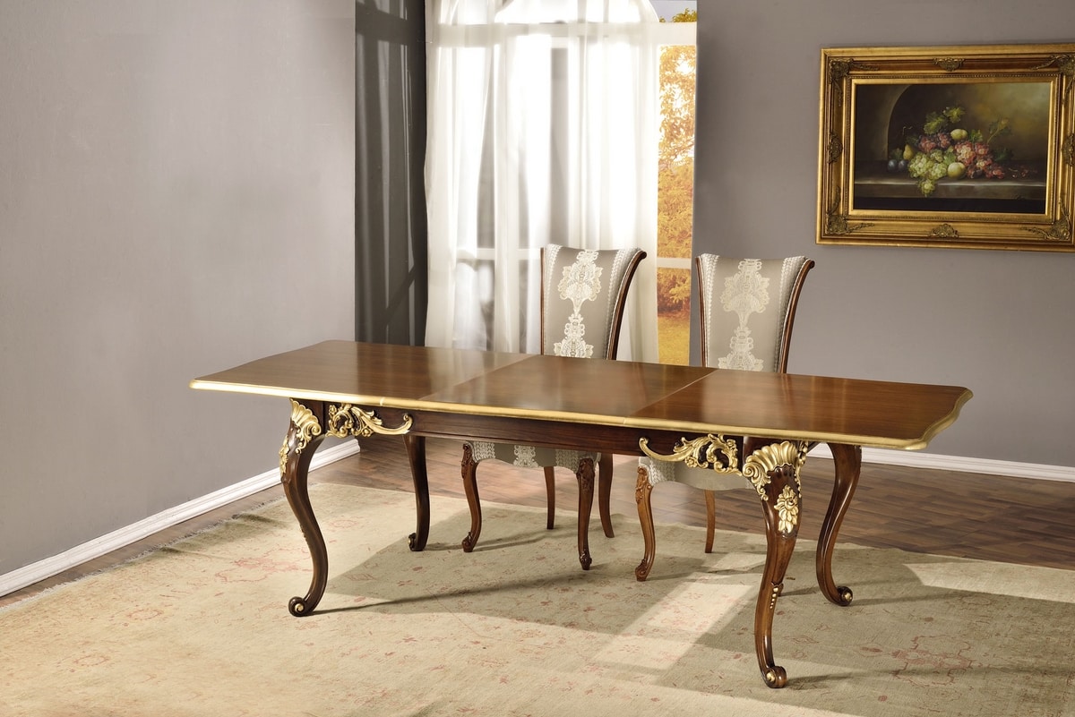 Tavolo rettangolare con allunghe, con finitura color noce e foglia oro.