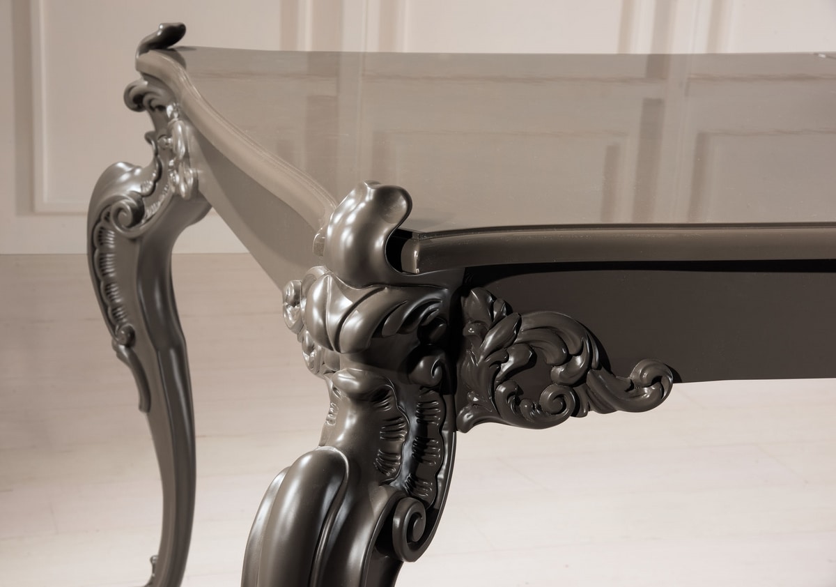 Piano in vetro, struttura in legno e gambe lavorate con particolari decorazioni.