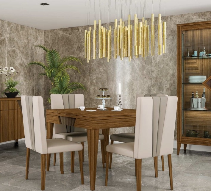 Tavolo da pranzo in legno noce canaletto, con piano quadrato allungabile.