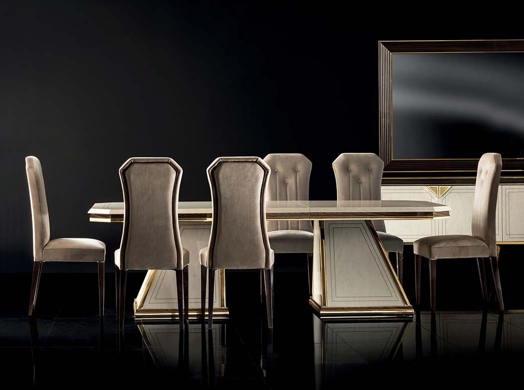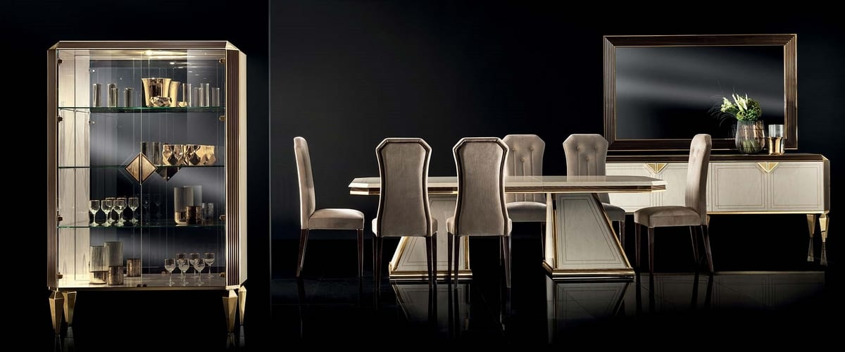 Lo stile della collezione Diamante trova negli elementi della zona giorno uno dei punti di maggior espressione del suo carattere. Le superfici vetrate si sposano con le linee essenziali e curate degli inserti in legno di olmo e le placche dorate, un intrigante rincorrersi di geometrie semplici che traducono la capacità, tutta italiana, di tenere insieme forme e colori, in un equilibrio perfetto di creatività e maestria. Ricevere ospiti in una luminosa sala da pranzo sarà un piacere, segno del gusto di saper scegliere lo stile migliore per raccontarsi.