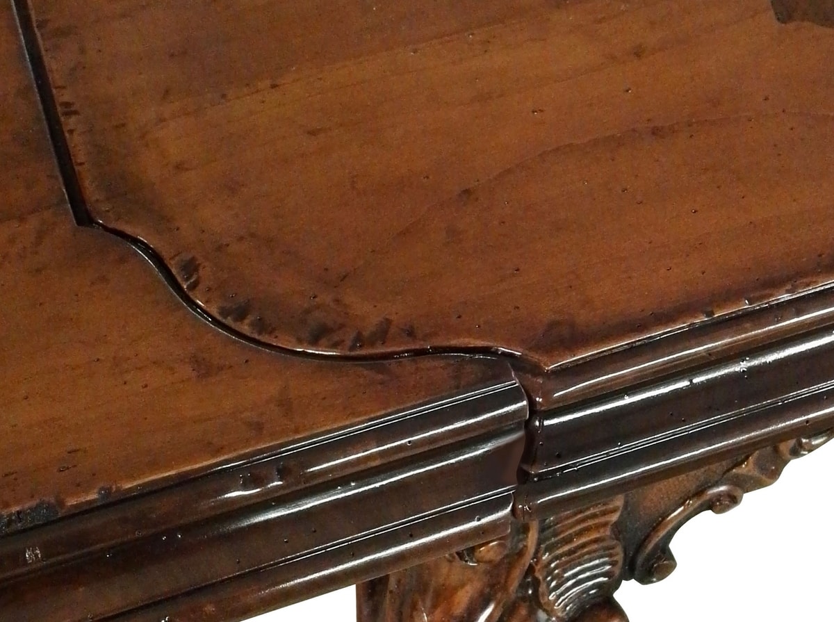 Tavolo allungabile in noce e ciliegio, ispirato al 1700 veneziano. Piano rettangolare con angoli sagomati e bordo a becco d'oca, con due allunghe da 57 cm ripiegabili lateralmente. La fascia lineare sottostante poggia su supporti ricurvi, intagliati a doppia voluta, ed uniti ad essa tramite catene sagomate. Le gambe sono decorate al ginocchio da un intaglio a voluta con inserto floreale pendulo, caratteristica tipica del Barocchetto Veneziano prossimo al Rococò.
