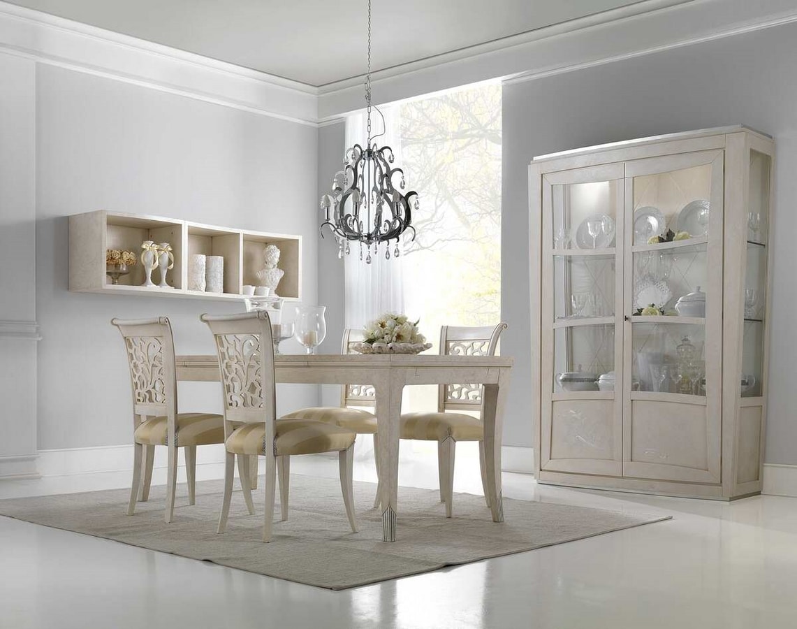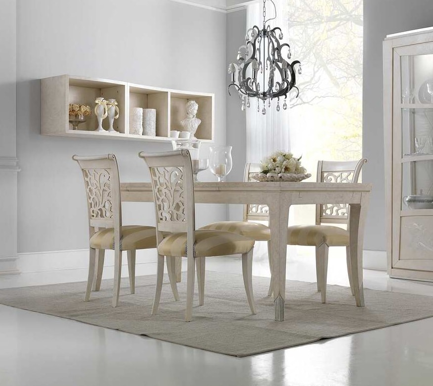 Tavolo da pranzo rettangolare, in legno laccato, con fregi decorativi argento. Allungabile.