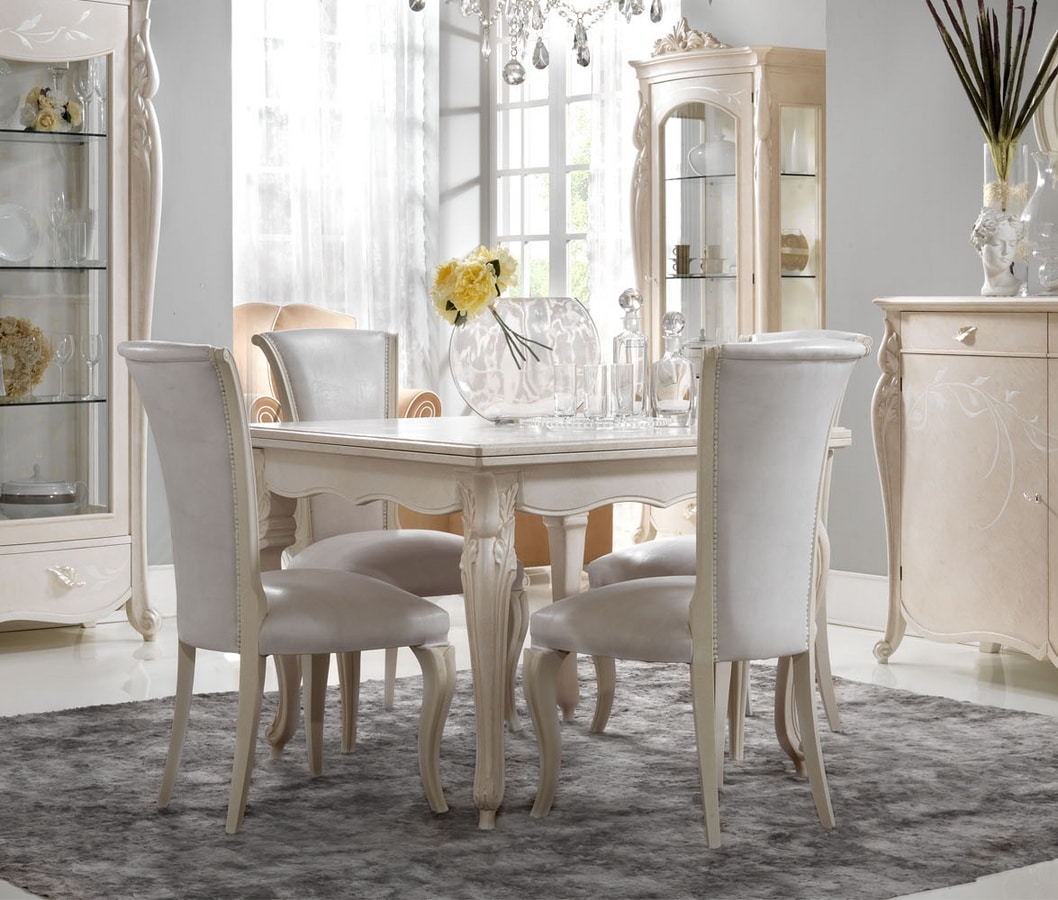 Tavolo da pranzo in legno, con piano quadrato allungabile. Finitura laccata.