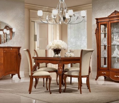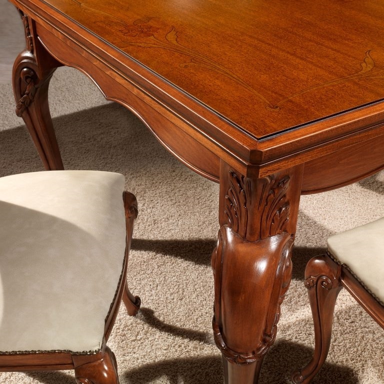 Tavolo da pranzo in legno, in stile classico, piano quadrato allungabile, con decori artigianali.