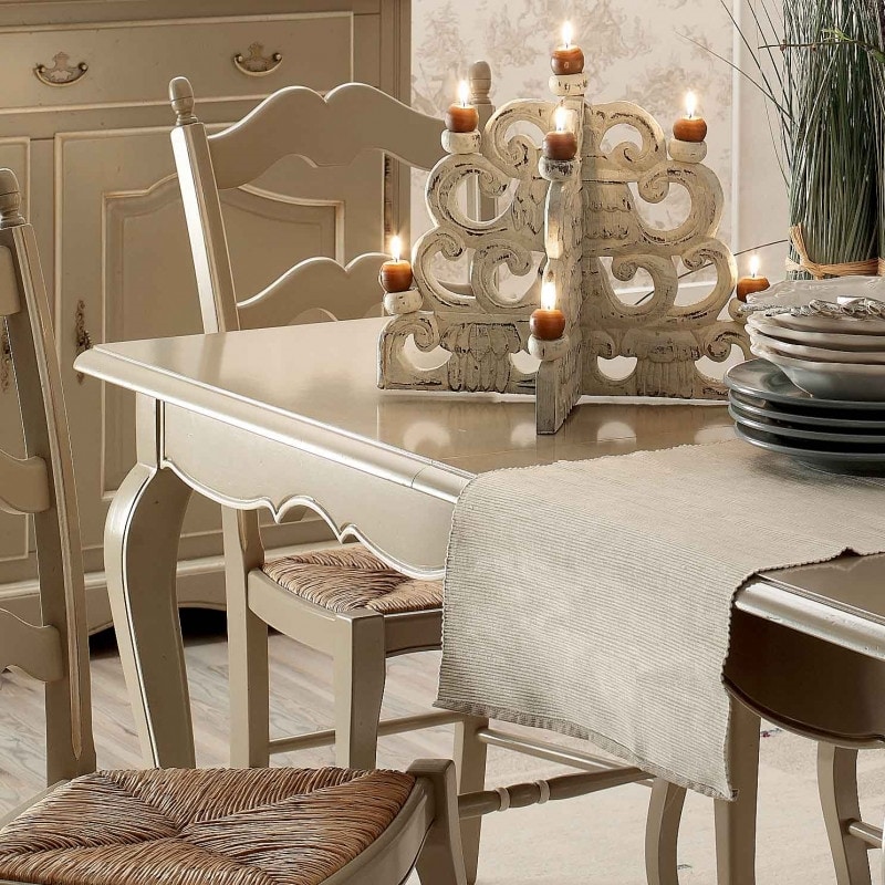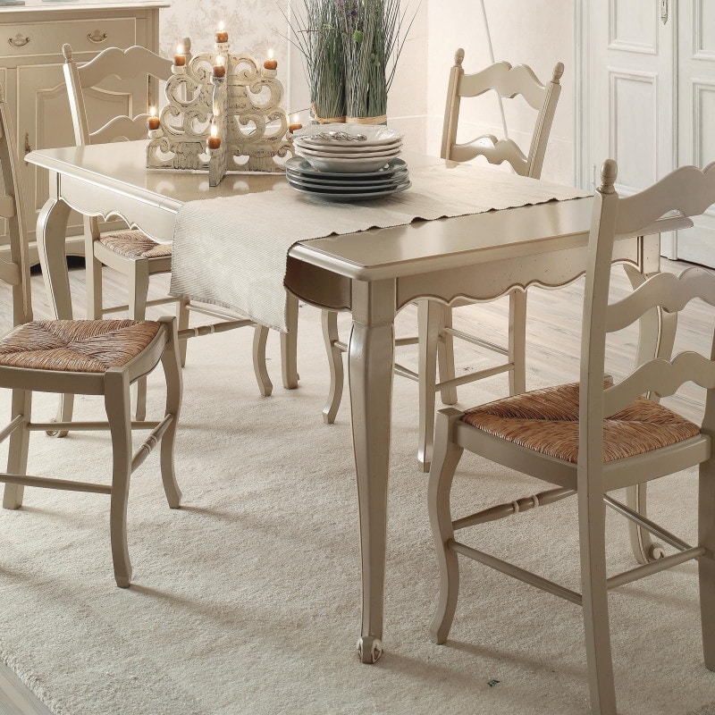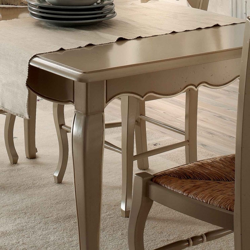 Richiedi prezzi Prodotti similiTavolo rettangolare allungabile con apertura al centro, dotato di due allunghe da cm 40, gambe sagomate con parte terminale lavorata a ricciolo. Fascia sottopiano a più volute con incisione.