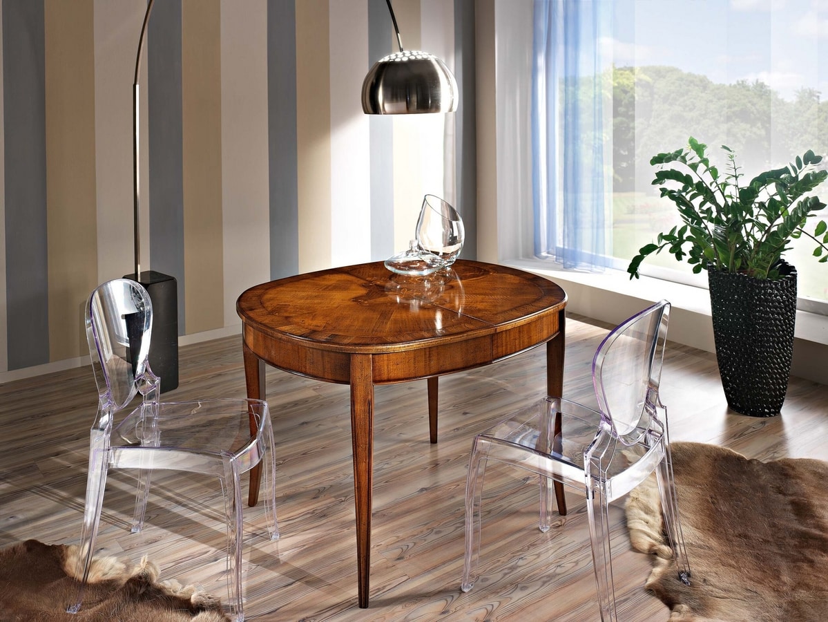 Tavolo ovale in stile classico, con piano allungabile. Decorato con intarsi.