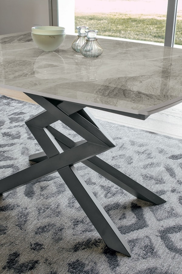 Tavolo allungabile con basamento in metallo. Piano girevole e allunghe laterali a botticella in gres porcellanato.