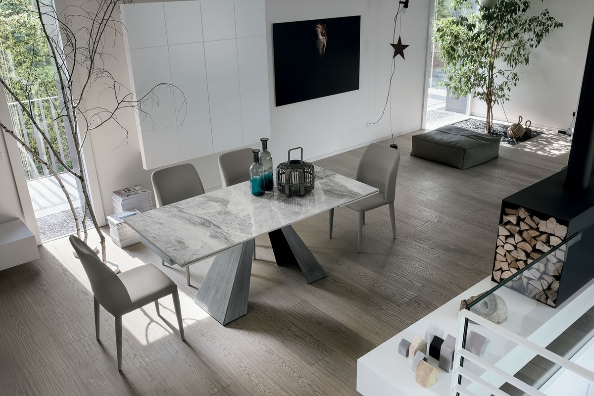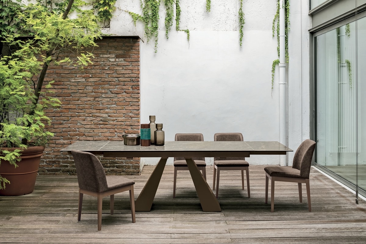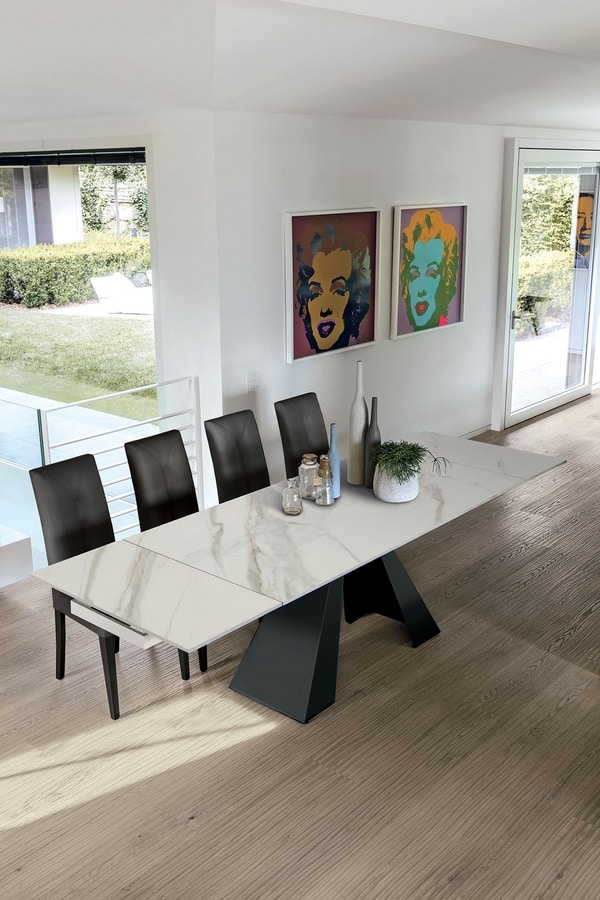 Tavolo allungabile con struttura in metallo verniciato o spazzolato. Piano ed allunghe laterali in gres porcellanato.