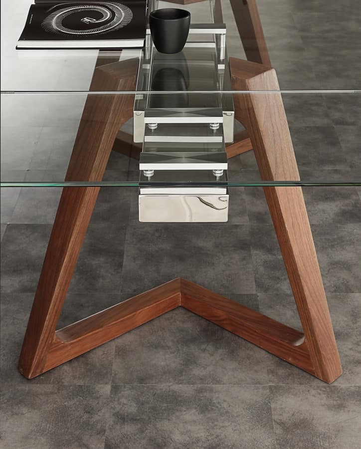 Struttura in acciaio lucido. Piano e allunghe in vetro trasparente.