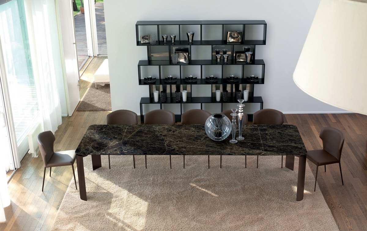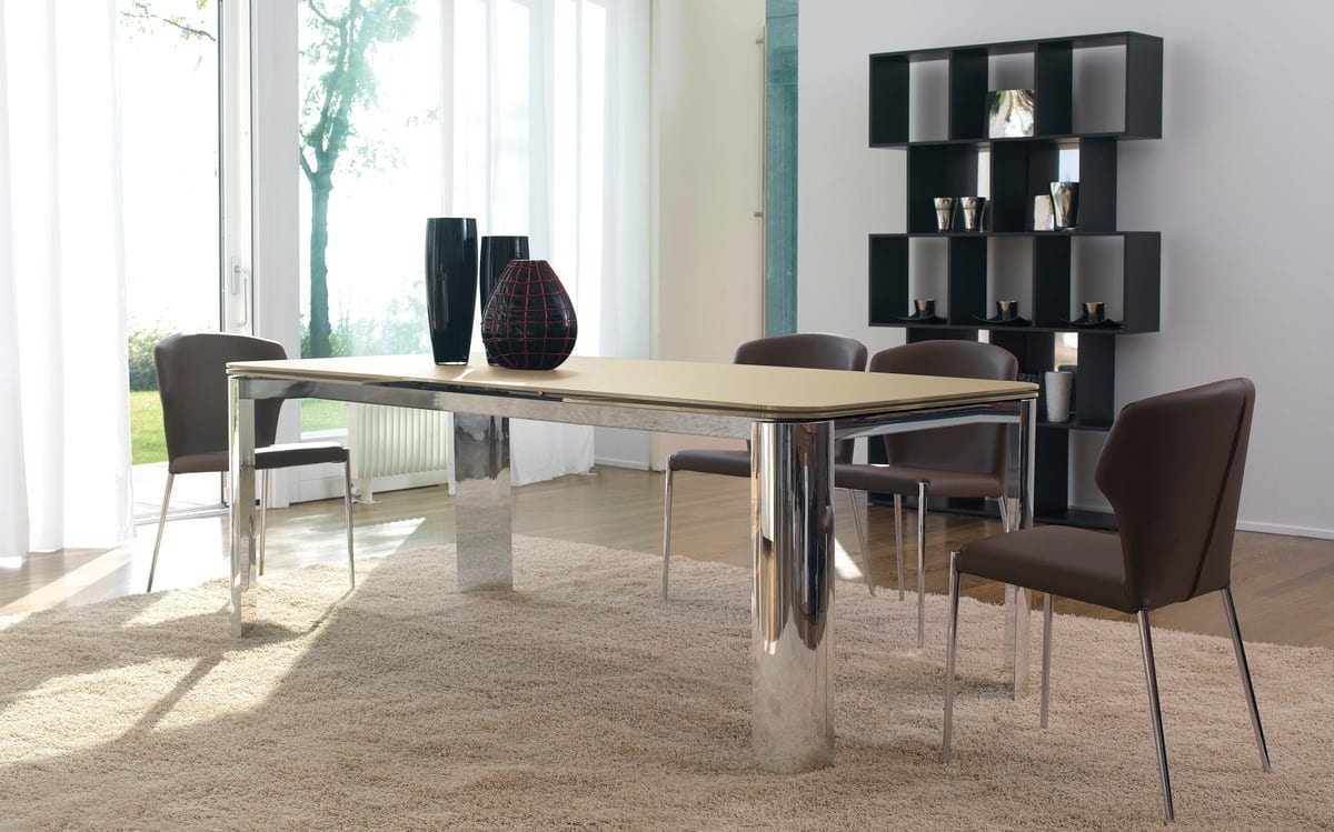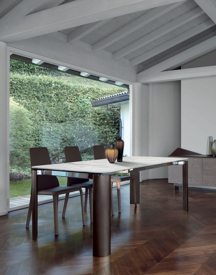 Tavolo allungabile con meccanismo automatico in alluminio, piano e doppia allunga laterale in cristallo temperato 12 mm o piano in ceramica. Gambe in alluminio, alluminio impiallacciato legno o verniciate cromato lucido.