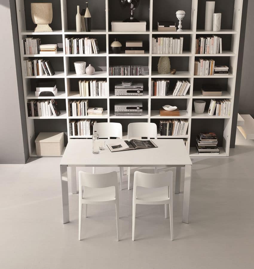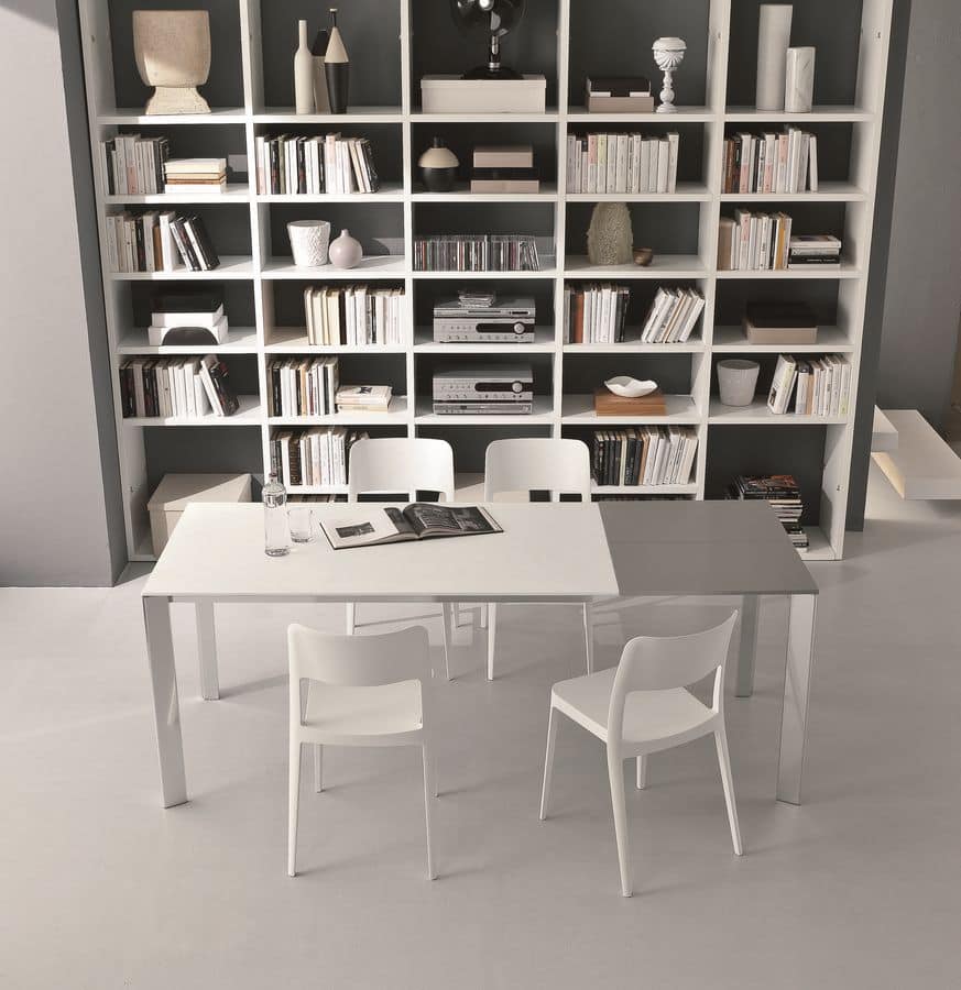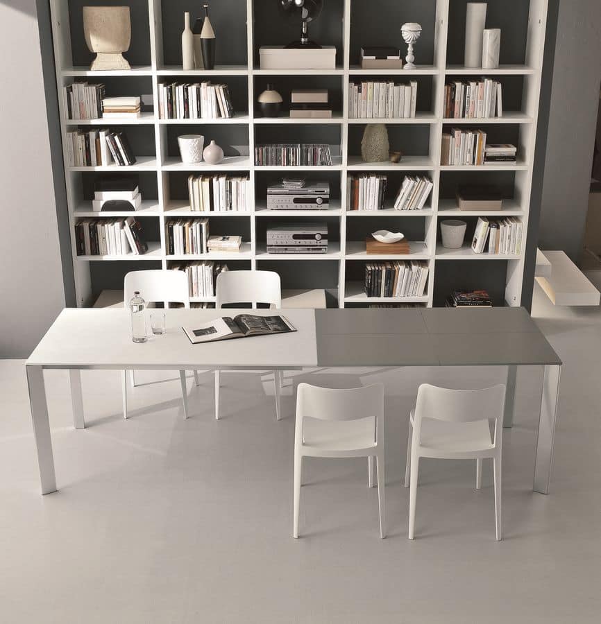 Tavolo estensibile con struttura in alluminio brill o verniciato. Doppio allungo in nobilitato grigio. Piano cristallo sp. 10mm colorato coprente cat.D,/E, nelle finiture lucida o satinato antimpronta oppure in melaminico bianco, nero, canaletto, rovere moro.