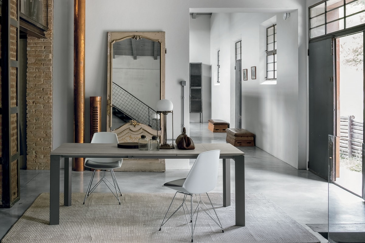 Tavolo allungabile in alluminio con gamba in metallo verniciato. Piano in gres porcellanato o vetro temperato con allunghe in MDF laccato in tinta con il piano o con la struttura, oppure piano ed allunghe in laminato effetto legno o effetto malta.