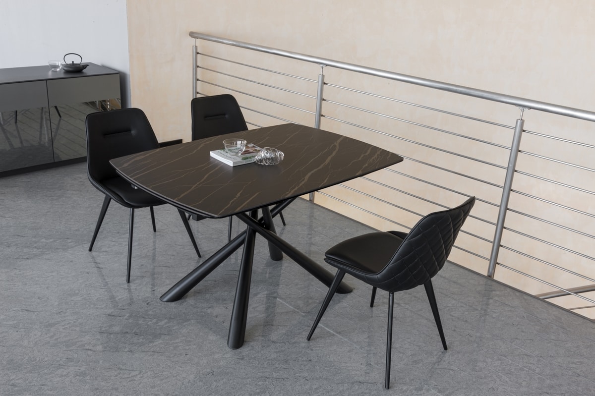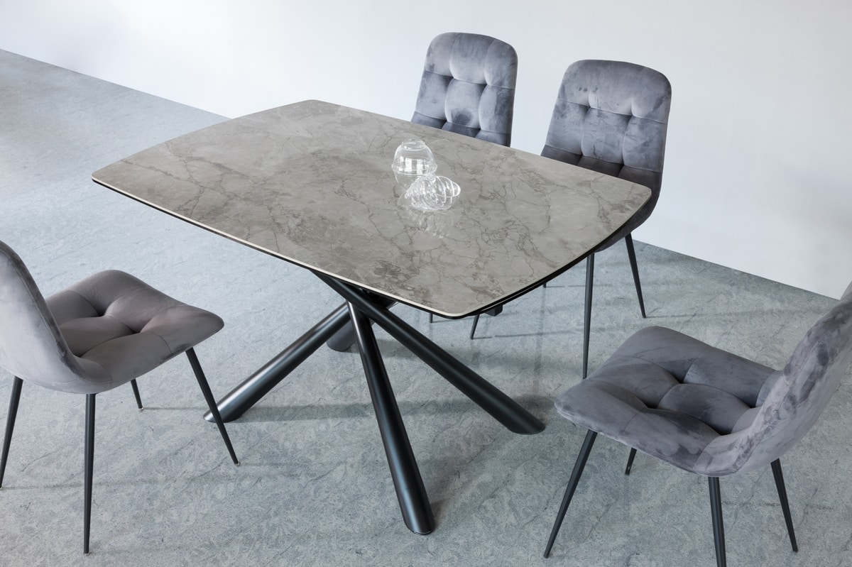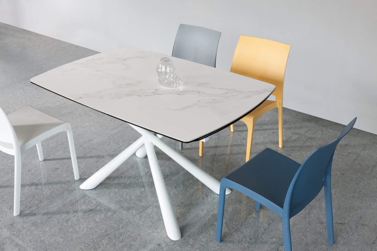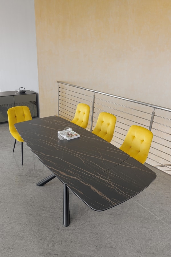Tavolo da pranzo allungabile con struttura in metallo verniciato. Piano in ceramica (6 mm) termo accoppiata con vetro molato (8 mm).