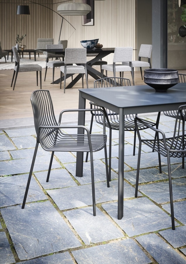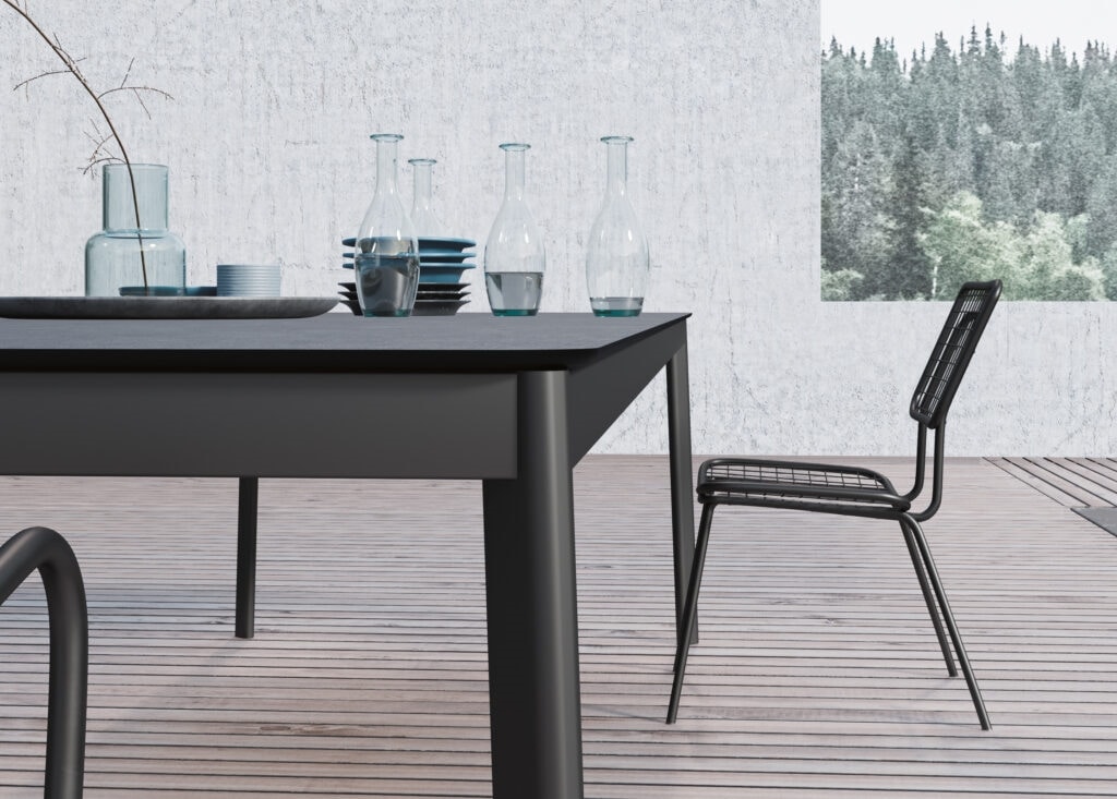 Il tavolo rettangolare Hula Hoop si compone di una struttura metallica, verniciabile in bianco o nero, che può essere abbinata ad un top in legno, fenix, hpl o ceramica. È disponibile sia fisso che estendibile con una o due allunghe.