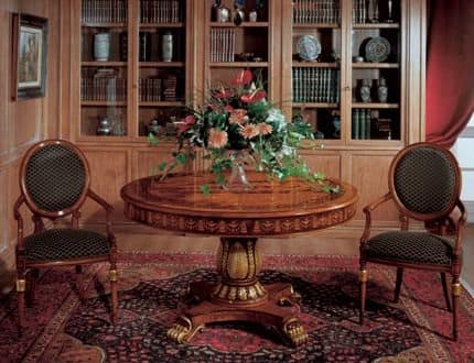 Tavolo tondo classico di lusso. Adatto per arredare sale da pranzo.