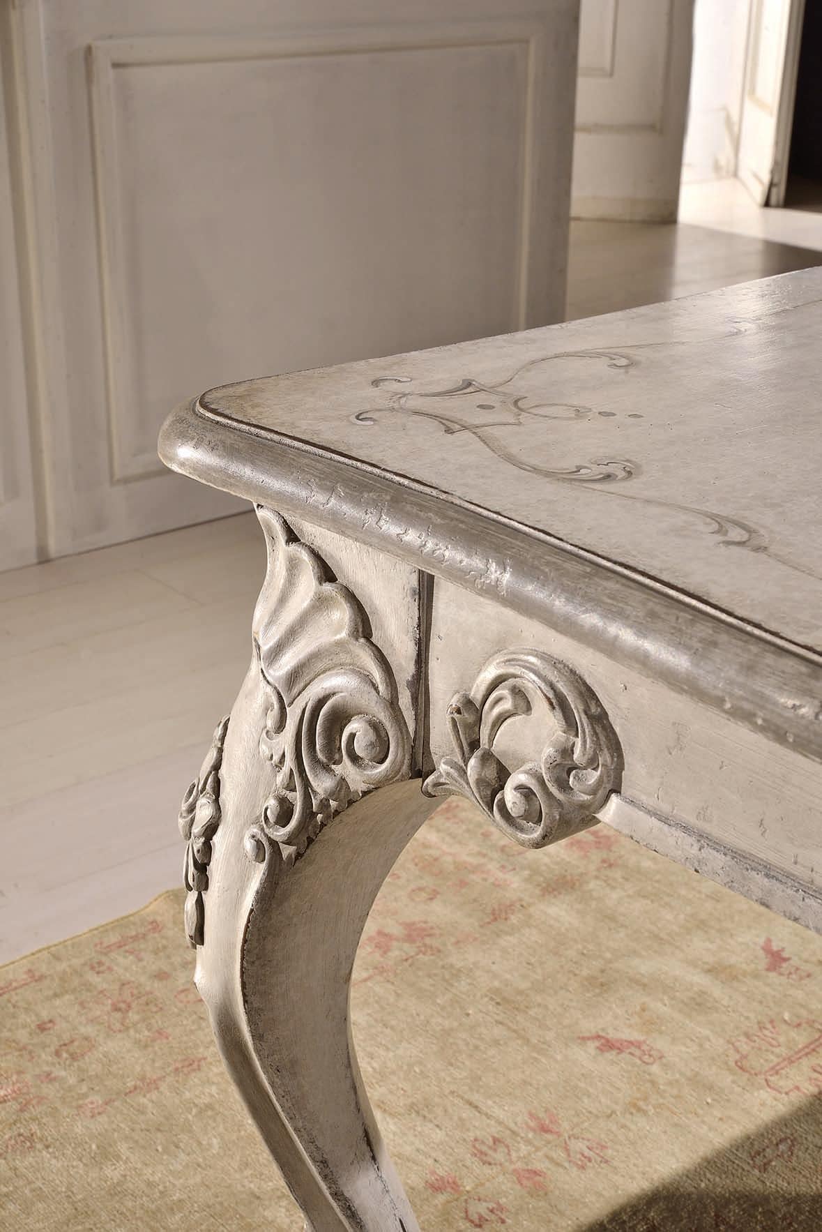 Tavolo rettangolare con allunghe, con finitura bianco provenzale anticato, con filetto grigio.