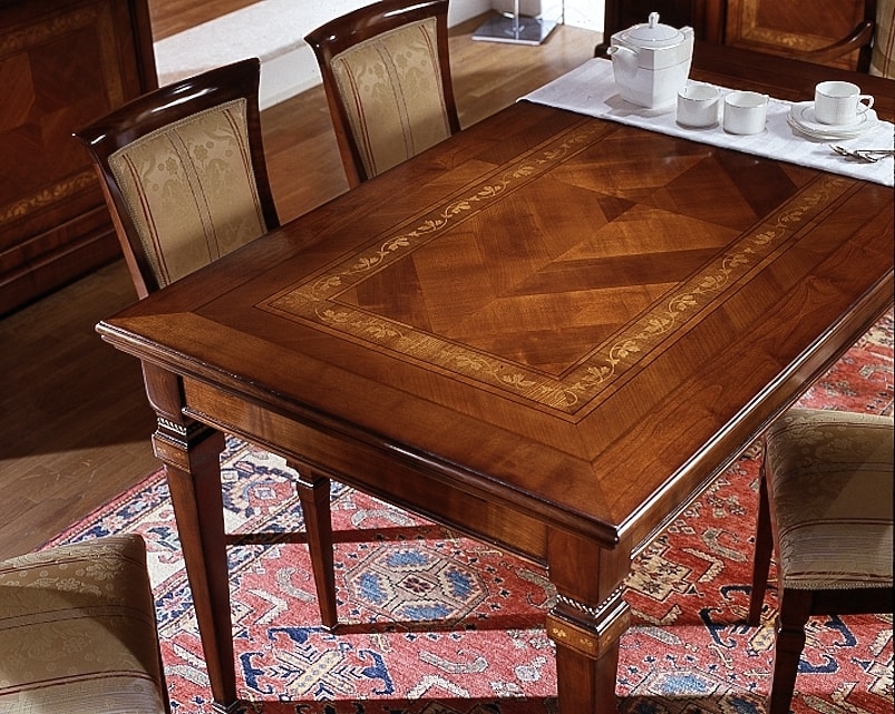 Richiedi prezzi Prodotti similiTavolo rettangolare in ciliegio, con intarsio floreale, con 2 allunghe da 45cm sfilabili da sotto il piano.