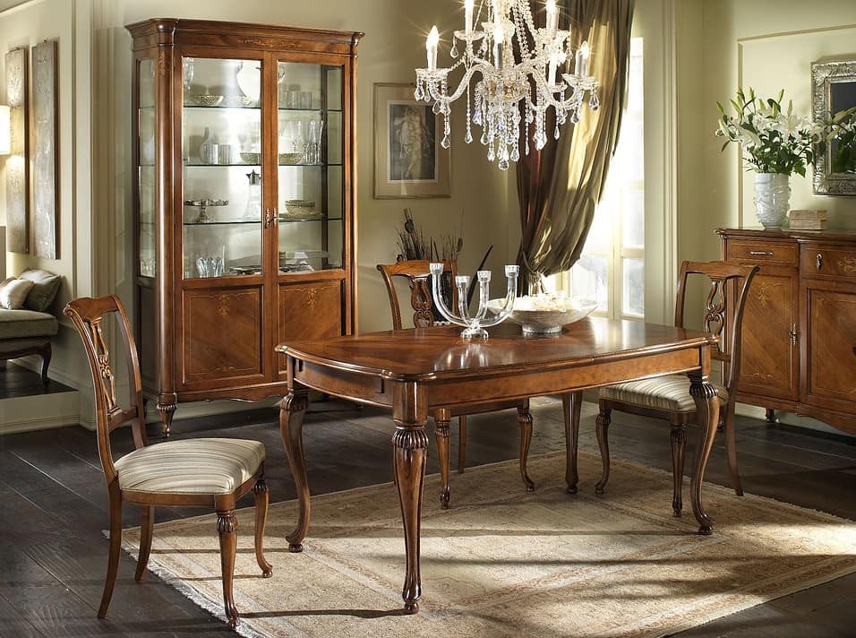 Estetica, stile ed una accurata ricerca di decorazioni intarsiate e impiallacciature di pregio danno vita a questi tavoli di Villa Giusti. In essenza di noce, con decori in acero, il tutto esaltato dall’importanza del processo di finitura.