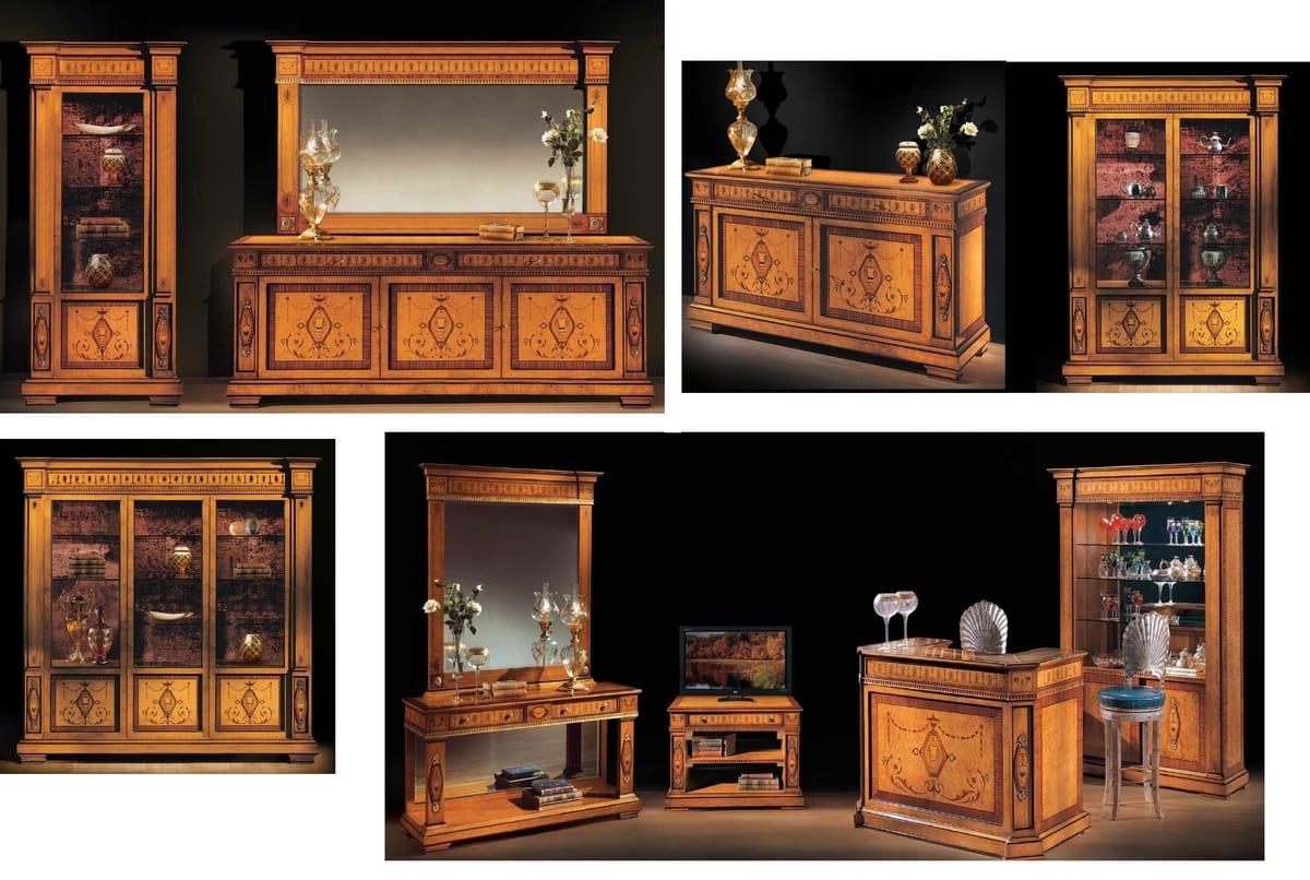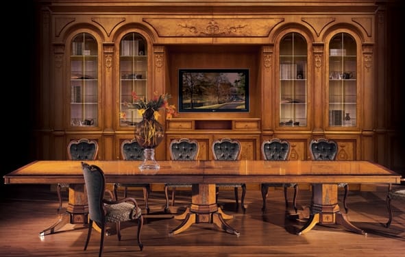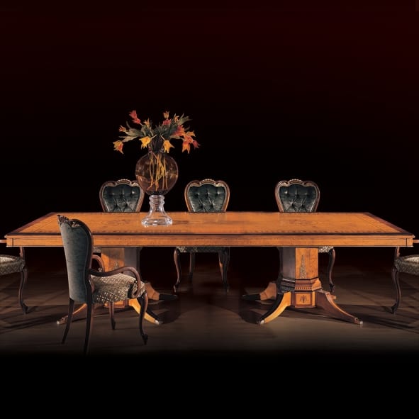 Richiedi prezzi Prodotti similiTavolo classico in stile. Realizzato in radica di mirto con intarsi in mogano, in finitura ciliegio patinato con dettagli oro e nero. Nelle nostre collezioni ci sono diversi modelli di tavolo intarsiato . Per accogliere i nostri ospiti a pranzo, abbiamo realizzato dei bellissimi tavoli di lusso, che arredano gli ambienti con gusto. I numerosi modelli di tavolo intarsiato Bellotti Ezio vengono riprodotti in diverse misure, per poter essere inseriti in modo armonico nelle varie sale da pranzo o sale riunioni. Proponiamo sale che sono sempre complete della vetrina, credenza e mobile TV. Al tavolo si possono abbinare molte tipologie di sedie per la cui imbottitura è disponibile una vasta gamma di tessuti di lusso da poter scegliere.