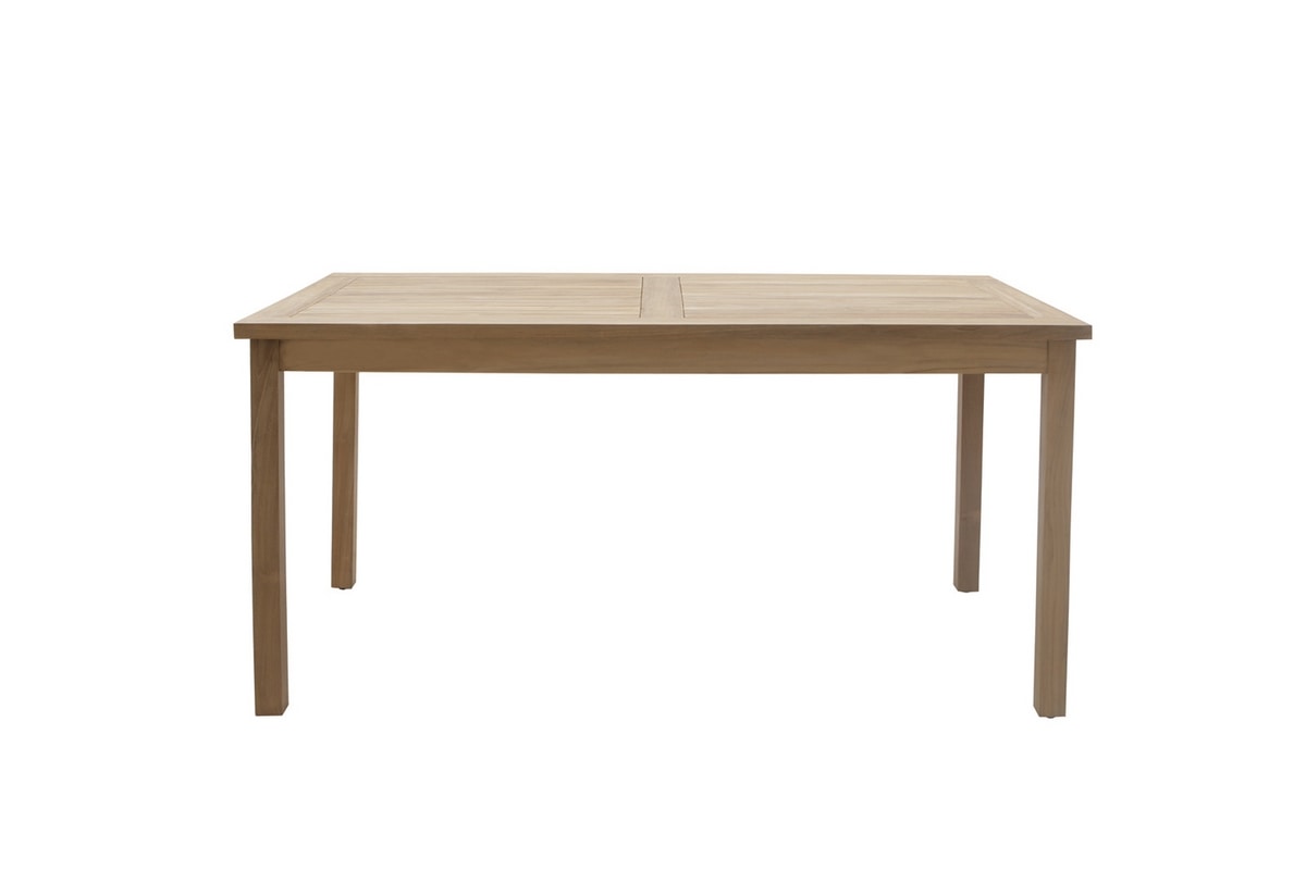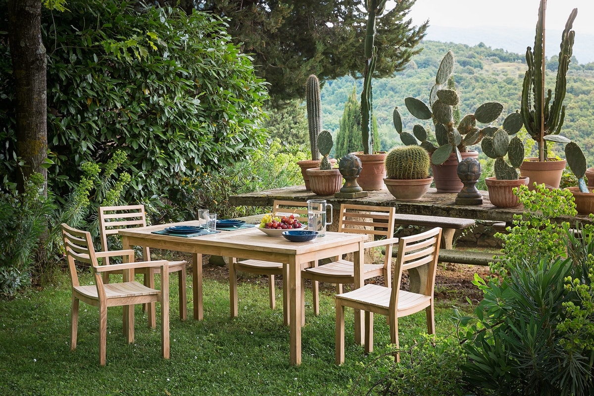 Tavolo rettangolare da esterno, con piano in listelli di teak leggermente separati per evitare il ristagno dell’acqua piovana. Il tavolo rettangolare da esterno è disponibile in tre diverse misure.