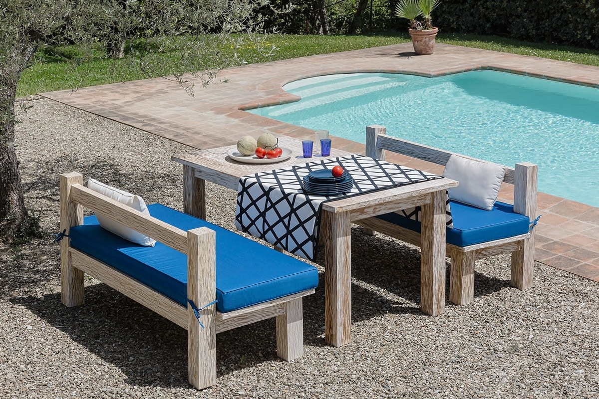 Tavolo rettangolare massiccio in teak sbiancato, con finitura speciale white sand. Il tavolo rettangolare massiccio White Sand ha una finitura molto originale e caratteristica che richiama il disegno del vento lasciato sulla sabbia, ruvida al tatto e magnifica se abbinata a colori accesi che ne risaltino l’originalità.