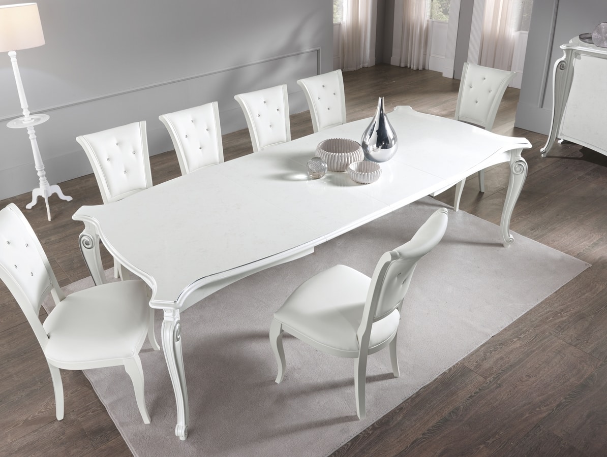 Tavolo Madreperla bianco, verniciato e decorato a mano. Con particolari in foglia argento, con gambe in legno intagliato. Due allunghi inclusi da cm 45.