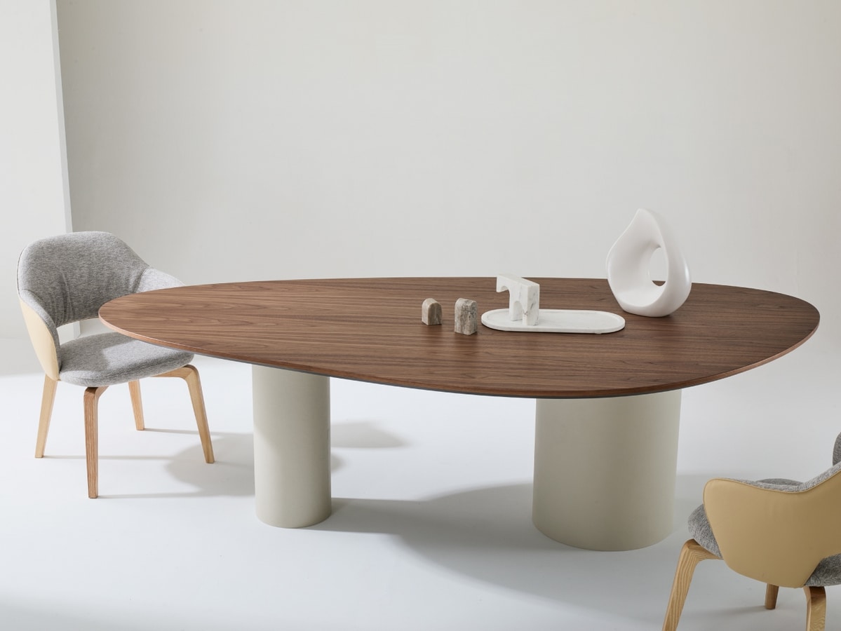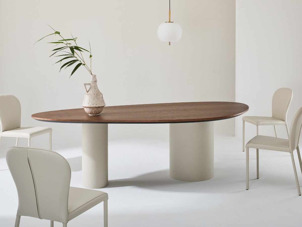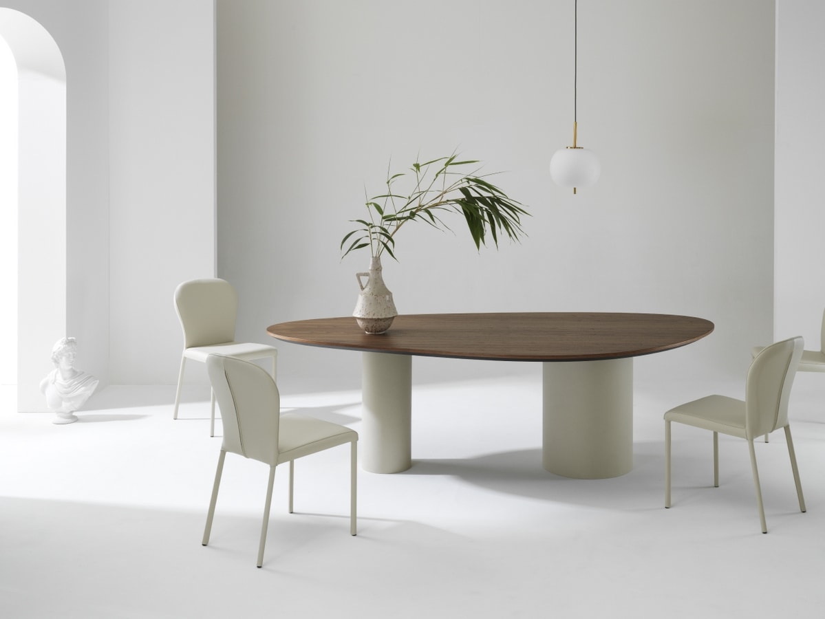 Tavolo in legno, con gambe cilindriche, solide e monolitiche