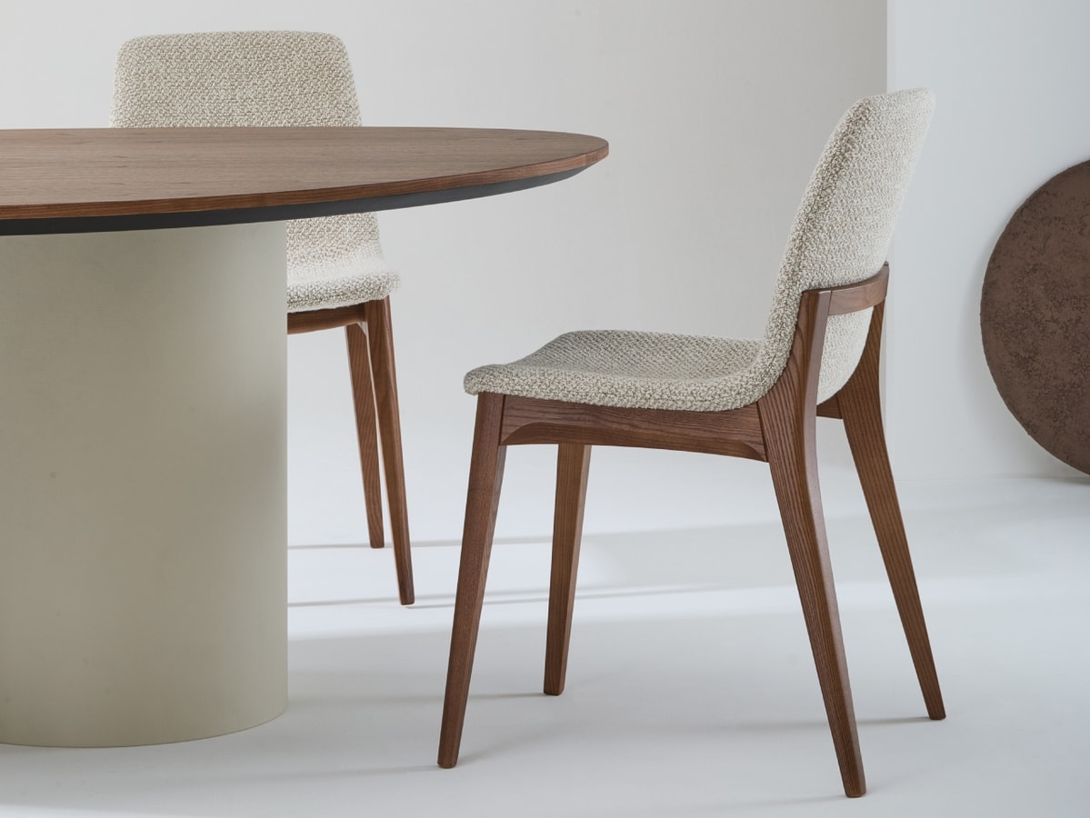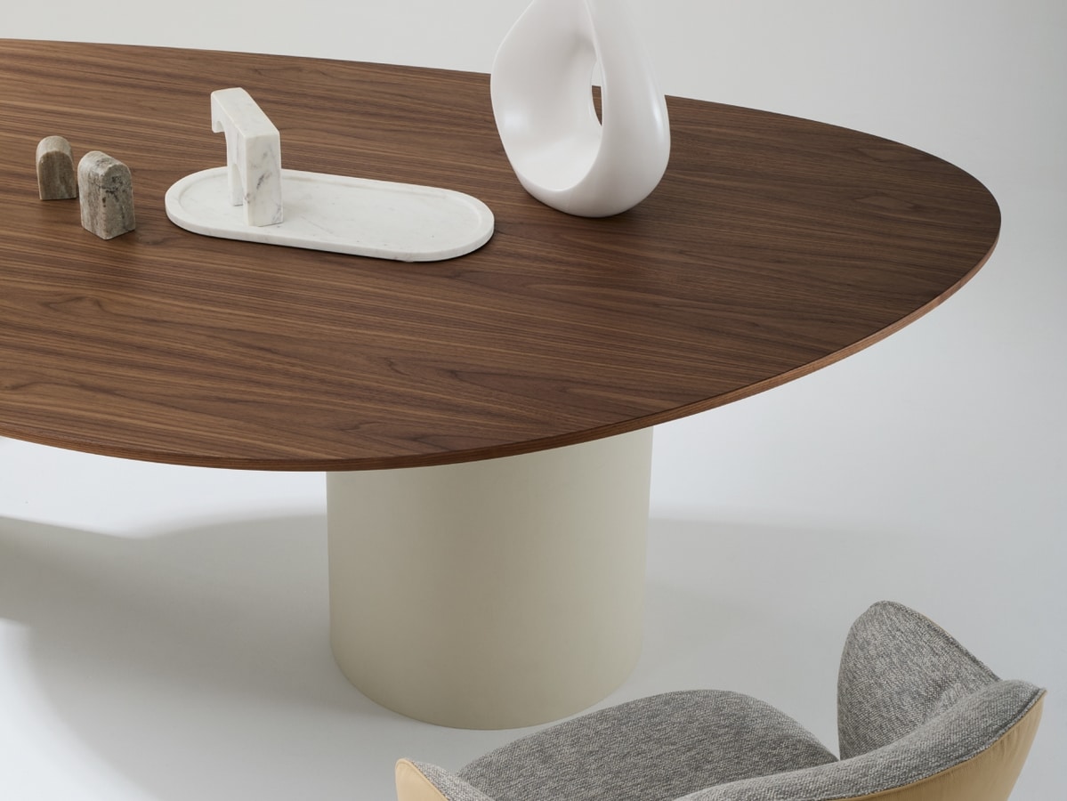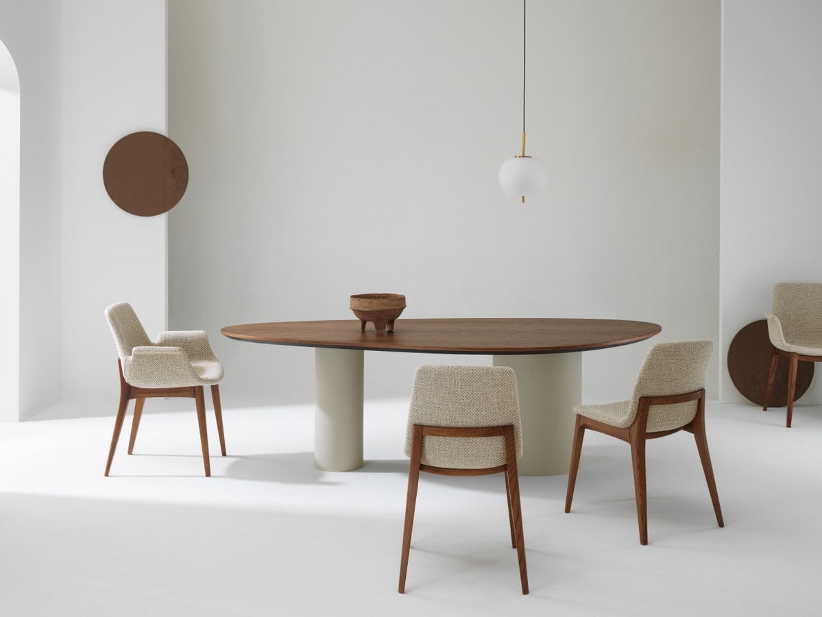 Tavolo in legno, con gambe cilindriche, solide e monolitiche