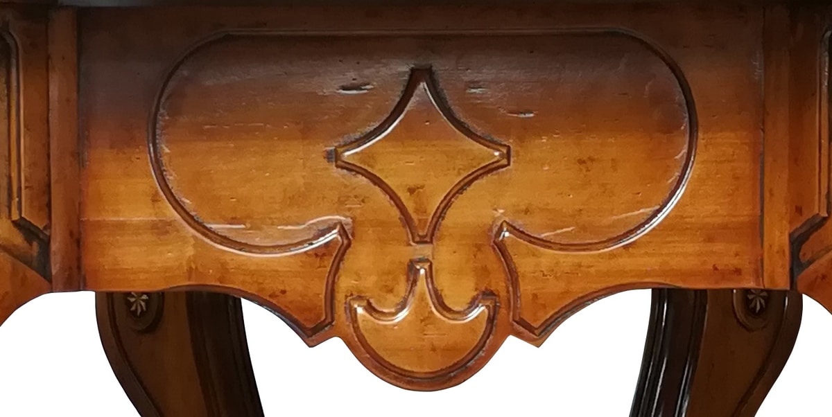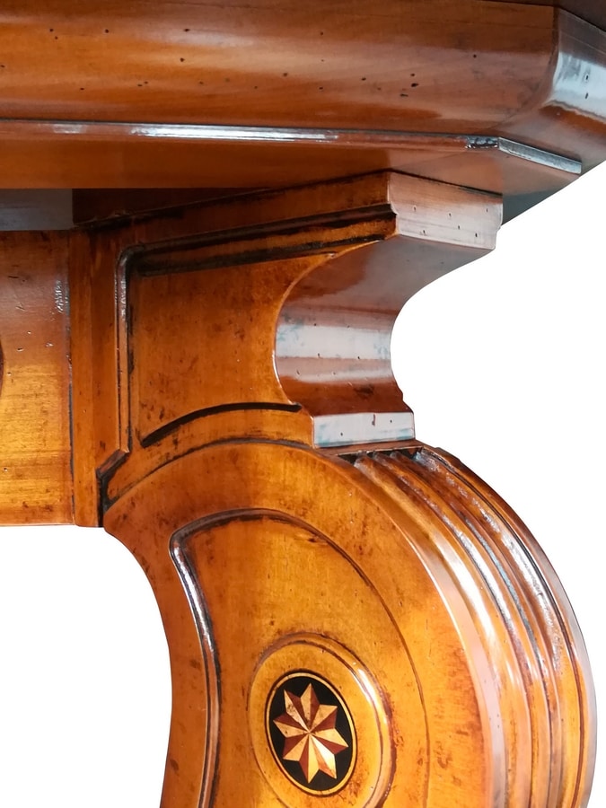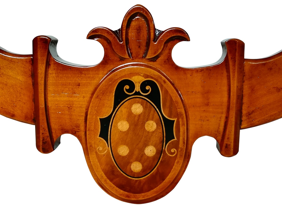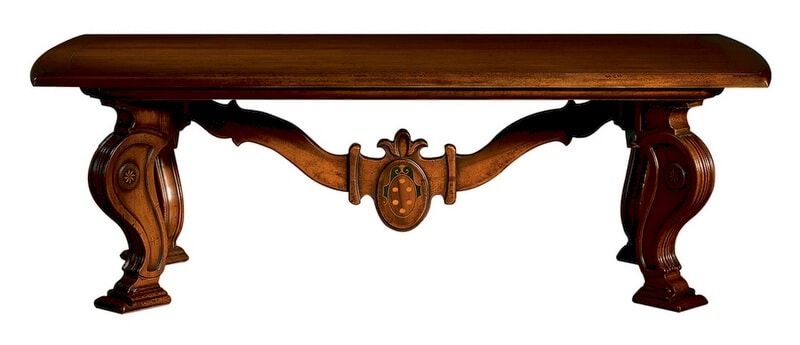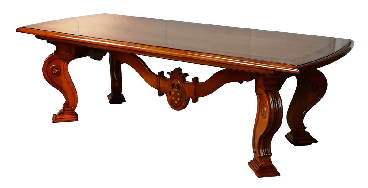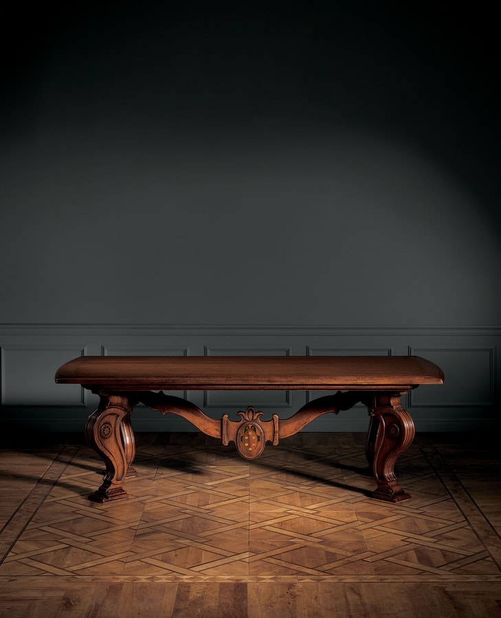 Tavolo in noce ispirato al '500 fiorentino ed, in particolare, ad un tavolo presente al Museo del Bargello di Firenze. Piano rettangolare di forte spessore con intarsio perimetrale geometrico. Quattro sostegni intarsiati ed intagliati sono uniti da un traverso sagomato riportante al centro lo scudo nobiliare del palazzo Bargello intarsiato in policromia di acero, ebano e noce.