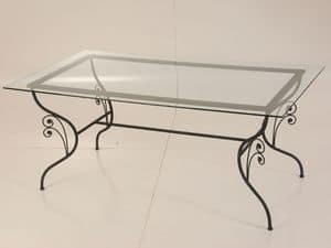 Tavolo in ferro battuto, piano in vetro, per uso esterno
