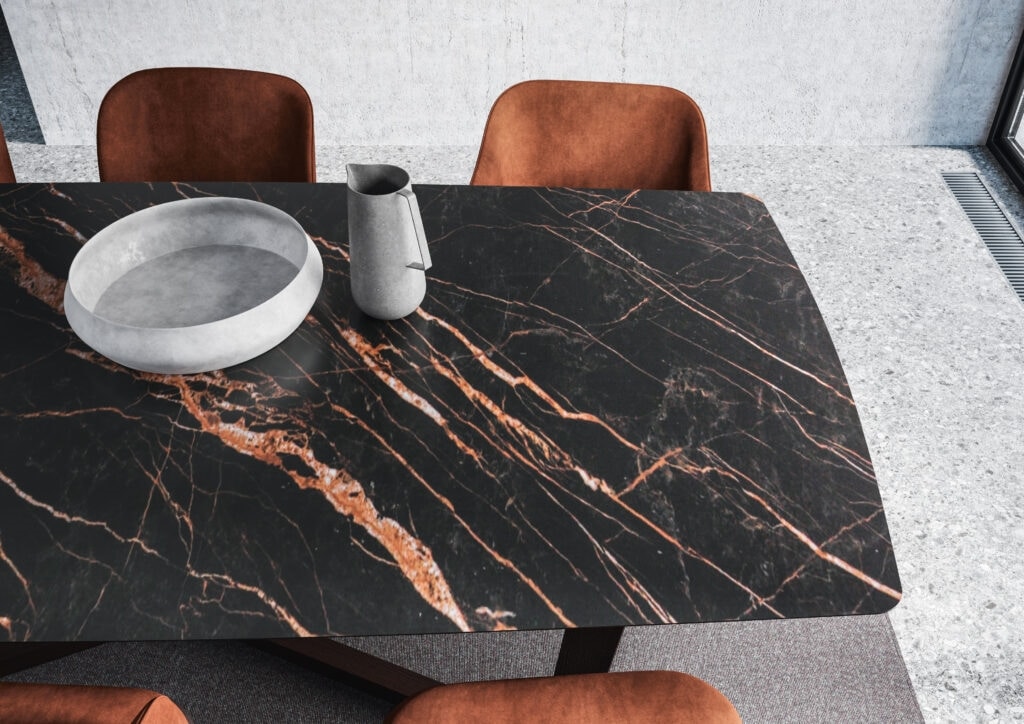 Tavolo quadrato, rettangolare, curvo, rotondo oppure ovale; top disponibile anche con bordo bisellato a 45° e base di sostegno ad incastro.