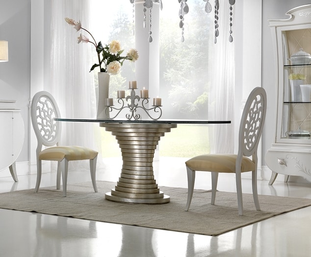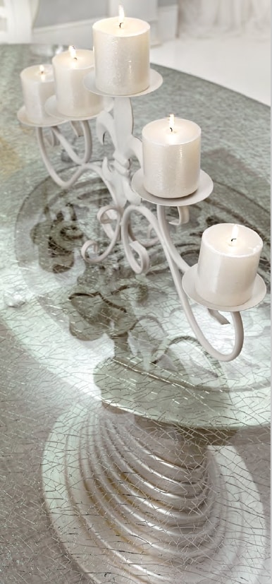 Tavolo ovale, con base in finitura argento, piano crak in vetro.