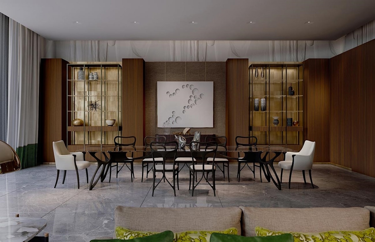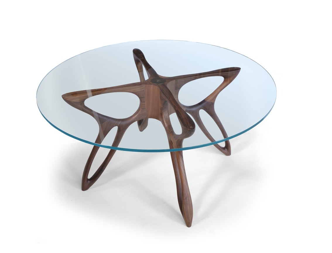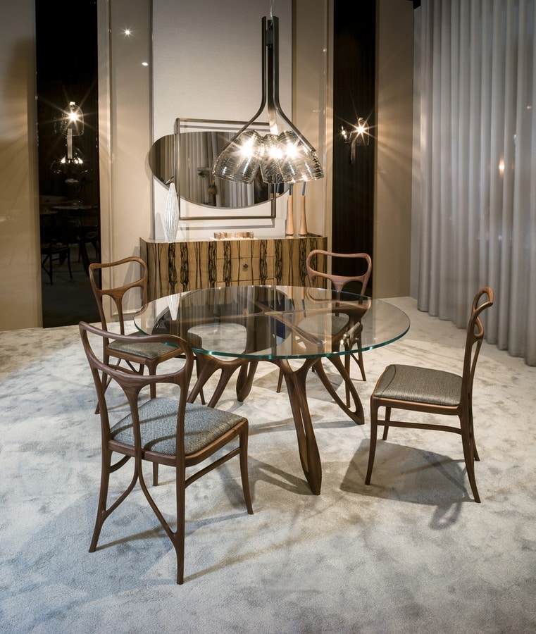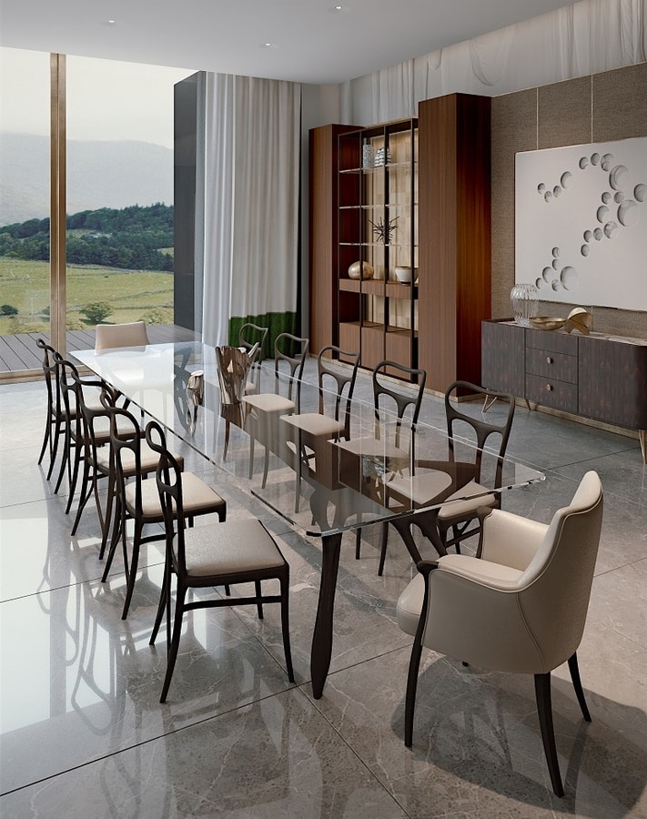 Tavolo da pranzo contemporaneo con base in noce canaletto. Il piano del tavolo è in vetro e permette di vedere la base plasmata in modo semplice e pulito. Accompagnato dalle sedie e dalle poltroncine in pelle e tessuto che lo rendono un tavolo adattabile anche ad ambienti di lavoro lussuosi. Disponibile anche in diverse finiture.