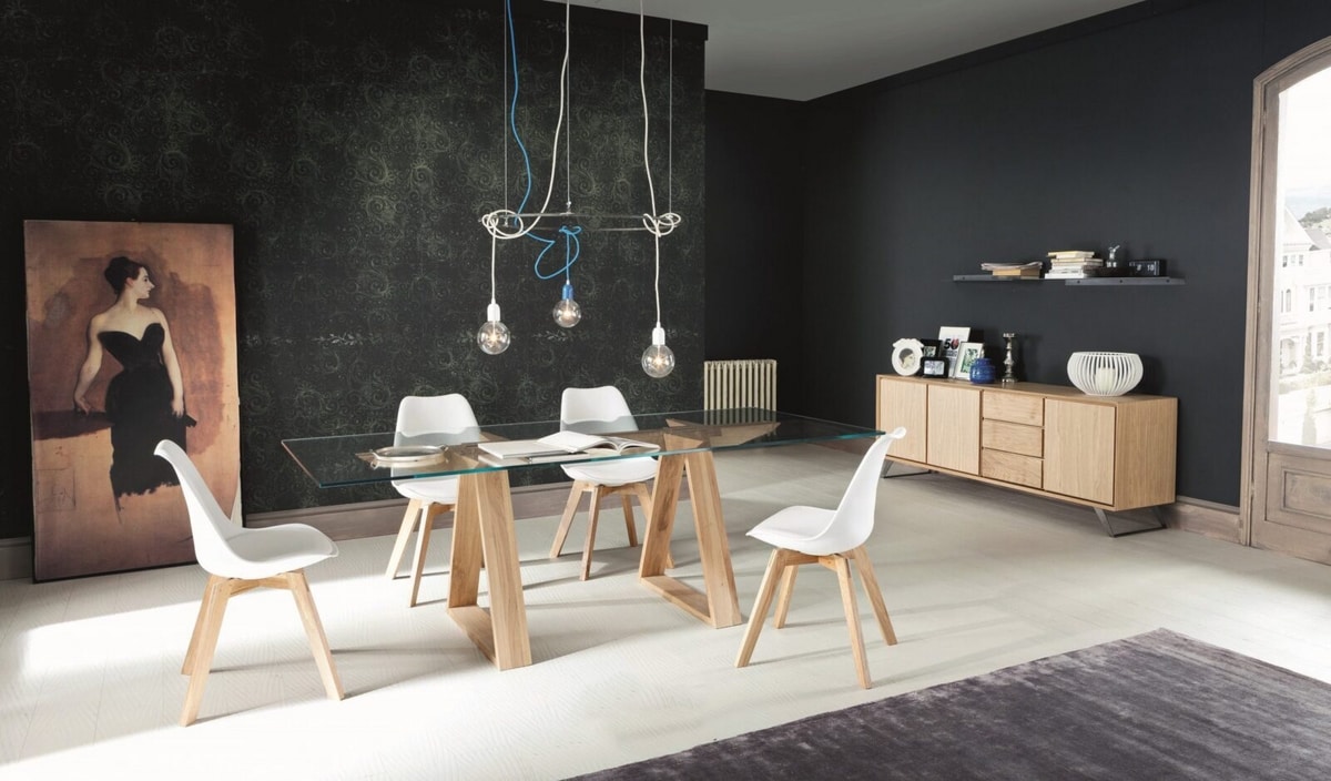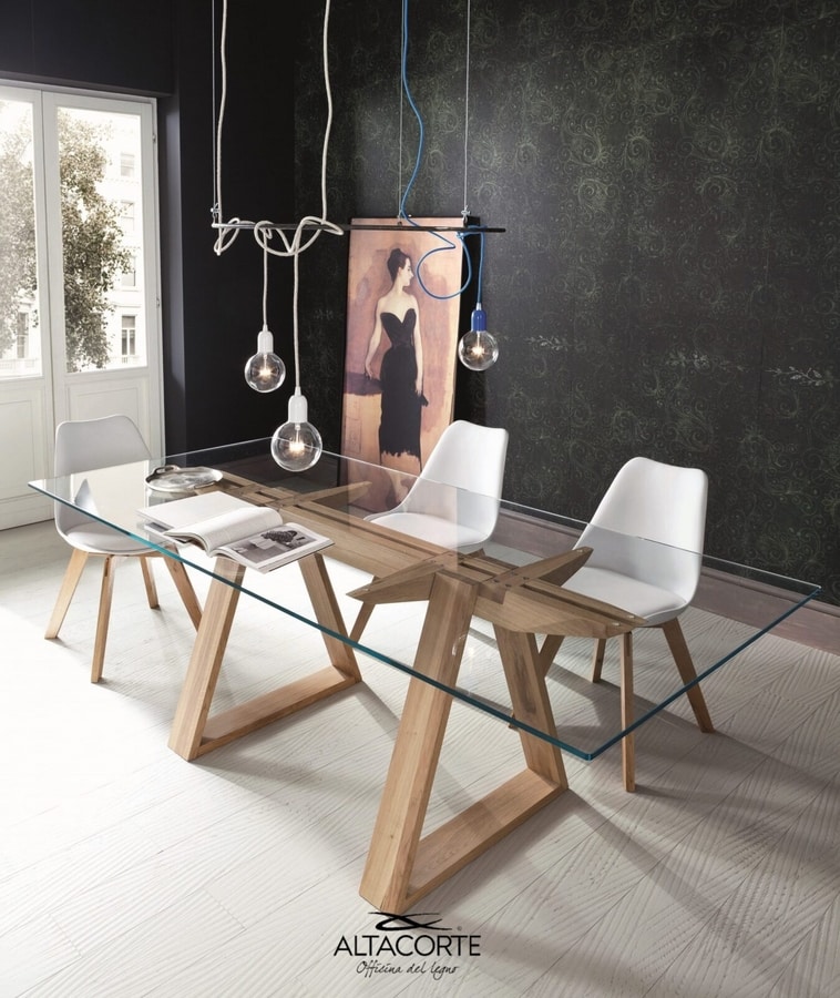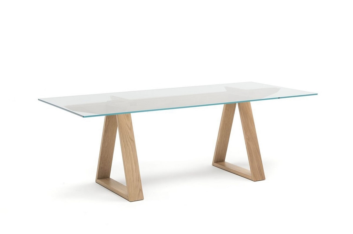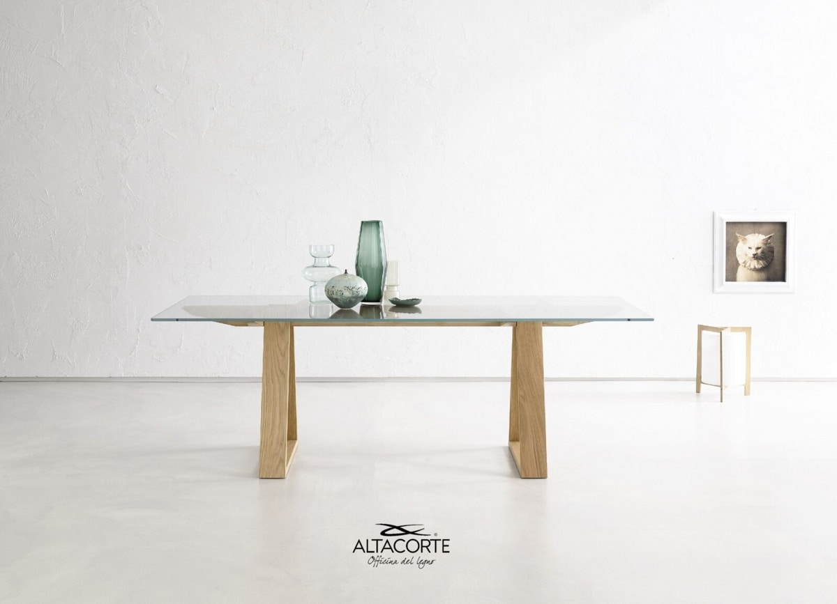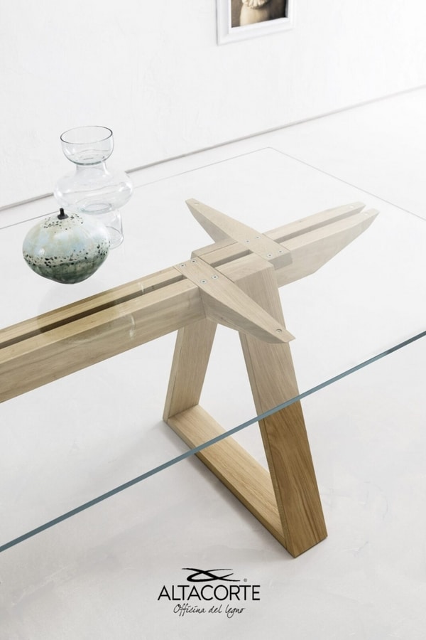 Basamento in massello di rovere europeo, piano in vetro temperato extra light sp.12 mm trasparente. Collanti vinilici all’acqua, vernici acriliche bicomponenti.