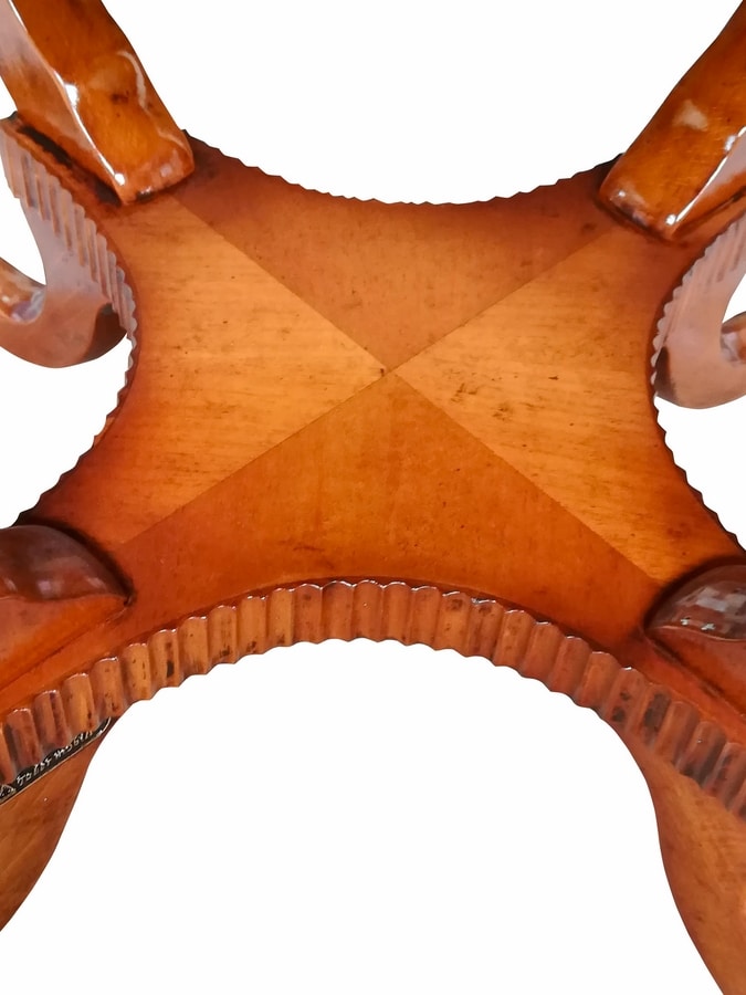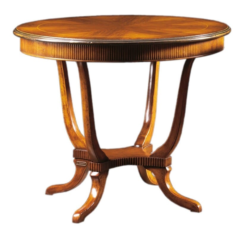 Tavolino rotondo in noce in stile inglese, piano intarsiato con filetto in legno di acero bianco e fascia sotto top con decorazione a costine. Le quattro gambe fortemente sagomate sostengono un pianetto che riprende la stessa lavorazione a costine del sotto top.