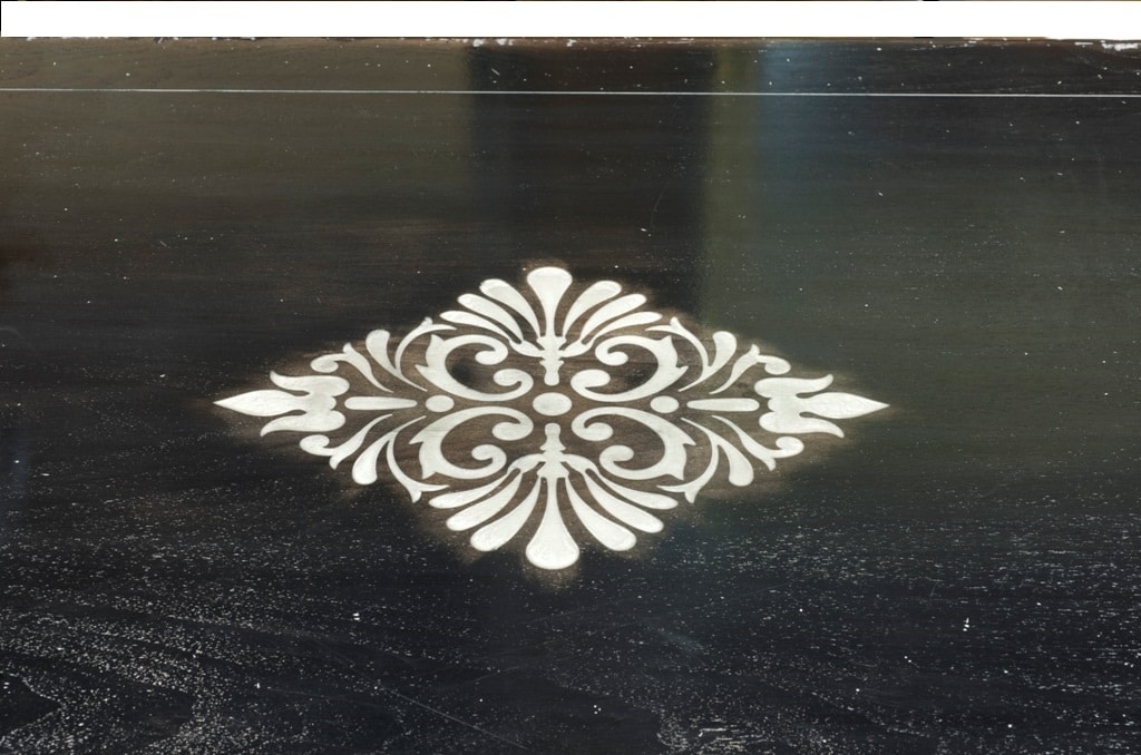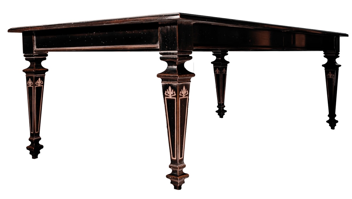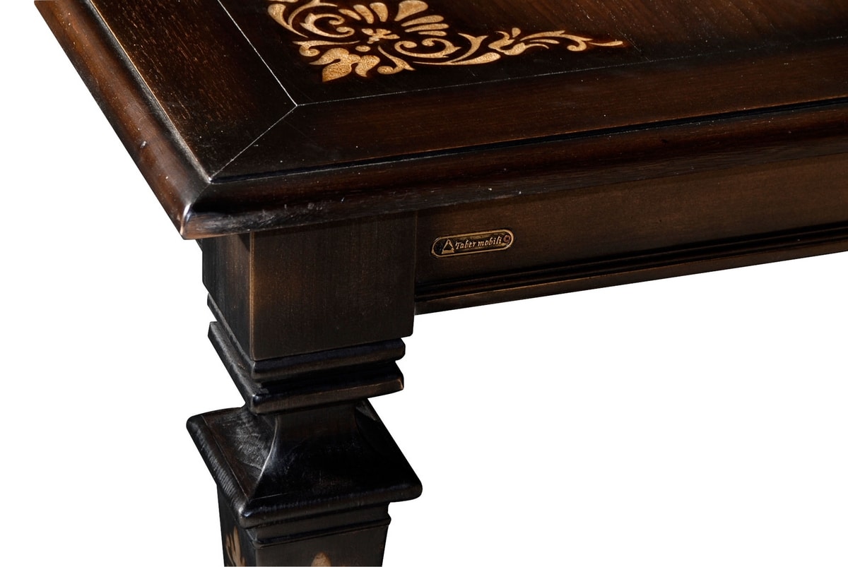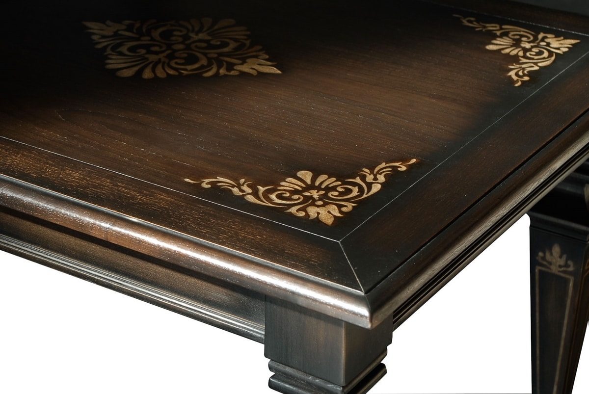 Tavolo rettangolare in noce, ispirato allo stile dell‘800, dotato di due allunghe da 50 cm riposte internamente; sul piano si evidenzia un intarsio alla Certosina, dalla trama intensa e minuta, disposto in disegno geometrico a contrastare la solenne materia lignea. Lo stesso si ripete altresì sulle allunghe e sui quattro lati delle gambe che presentano una tripla sagomatura parziale a sezione quadrata e desinenza a spillo. Nella foto, legno di noce tinto ebanizzato con patina (codice:CE01), normalmente anticato.