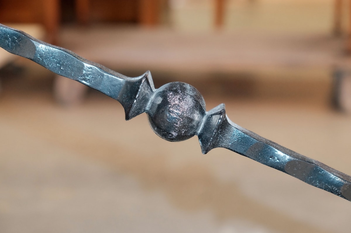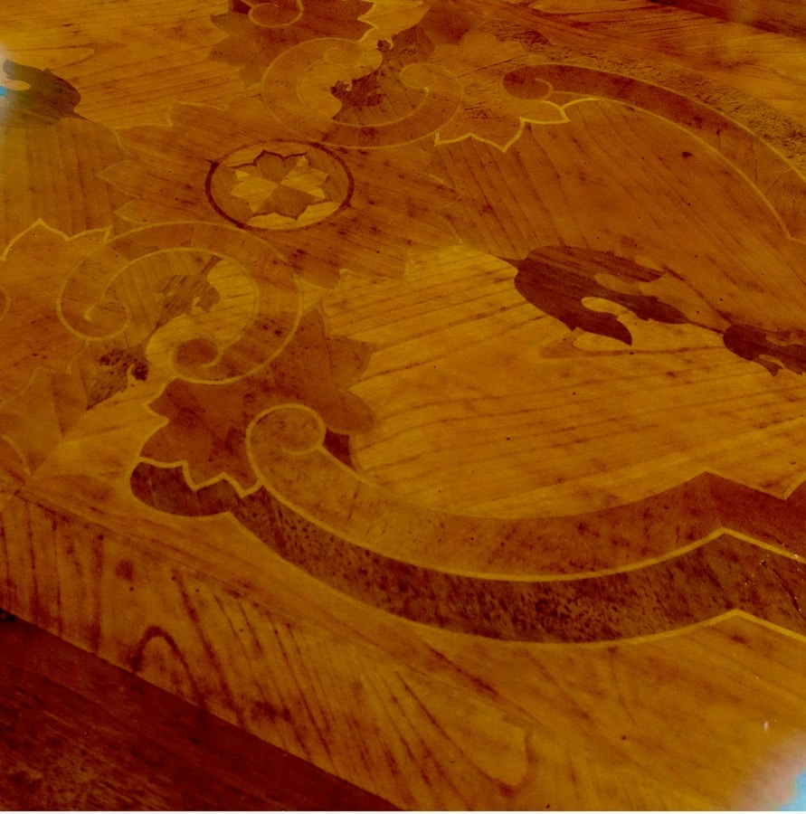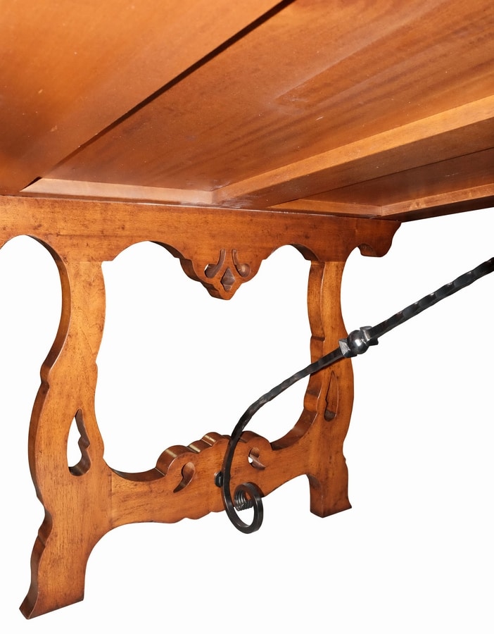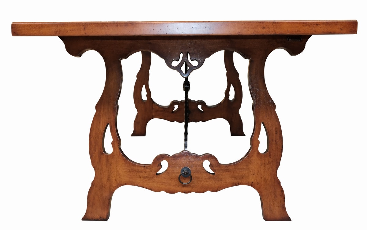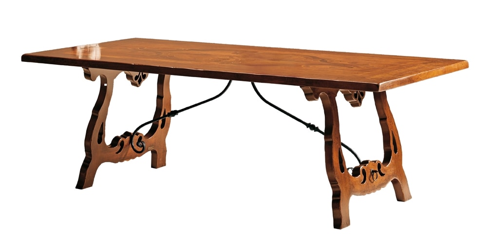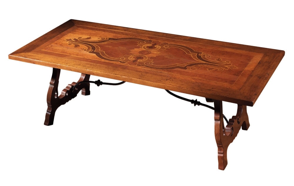 Tavolo trevigiano rettangolare in noce, ispirato allo stile del tardo 1600 ed inizi del 1700. Piano caratterizzato da un raffinato gioco di intarsi, una trama leggera di essenze di ciliegio, acero e noce che carica di cromatismo i motivi ornamentali naturalistici tipici della zona trevigiana. Alla base, due sostegni traforati a forma di lira uniti al piano tramite due traversi in ferro battuto sagomato, elemento tipico invece della zona lombarda.