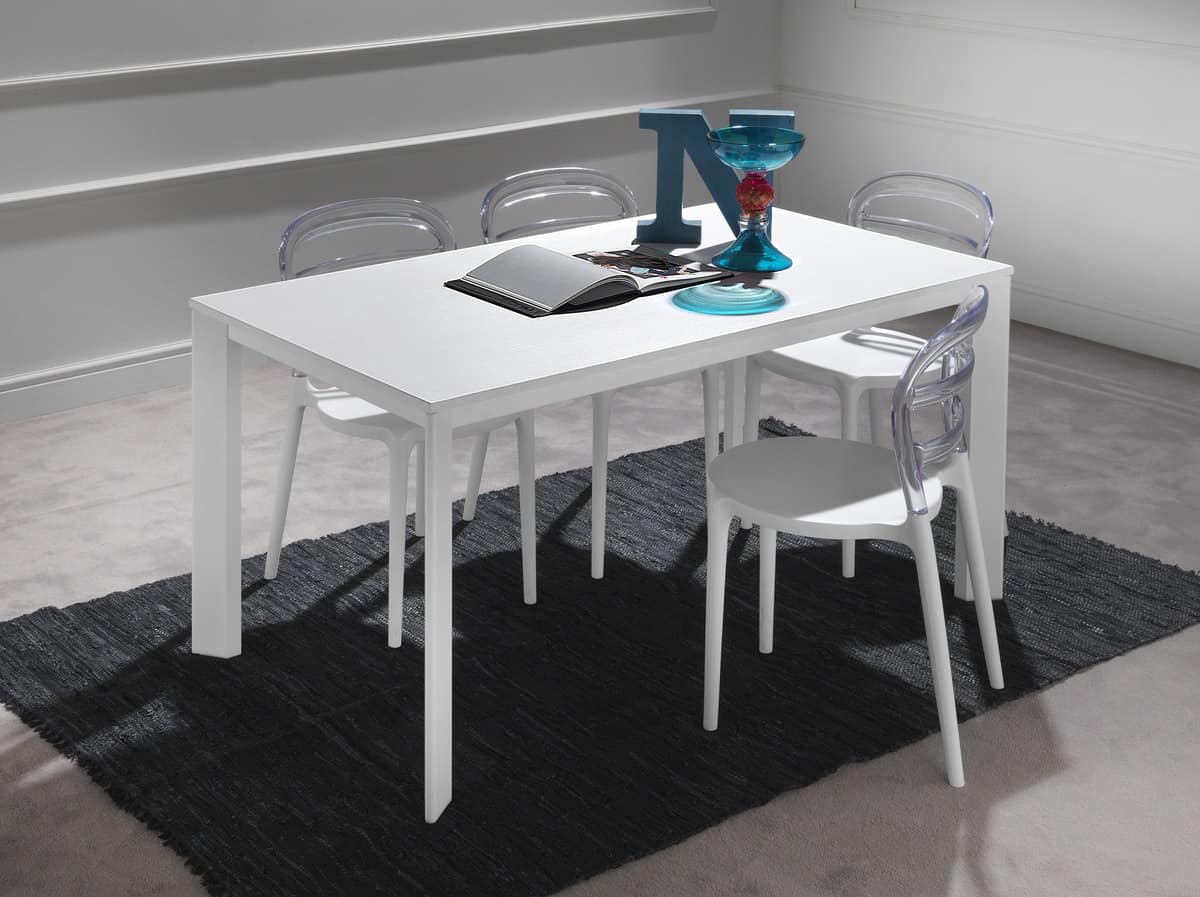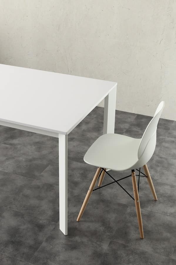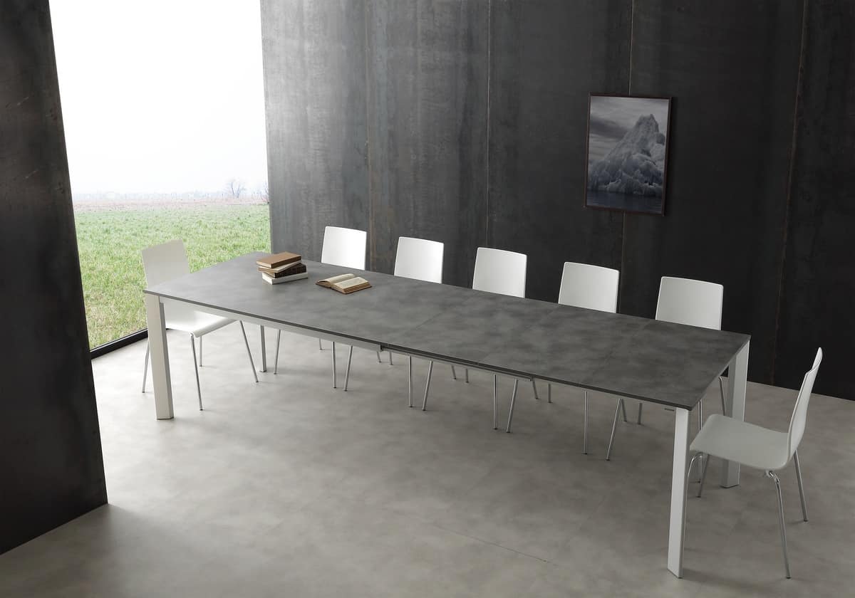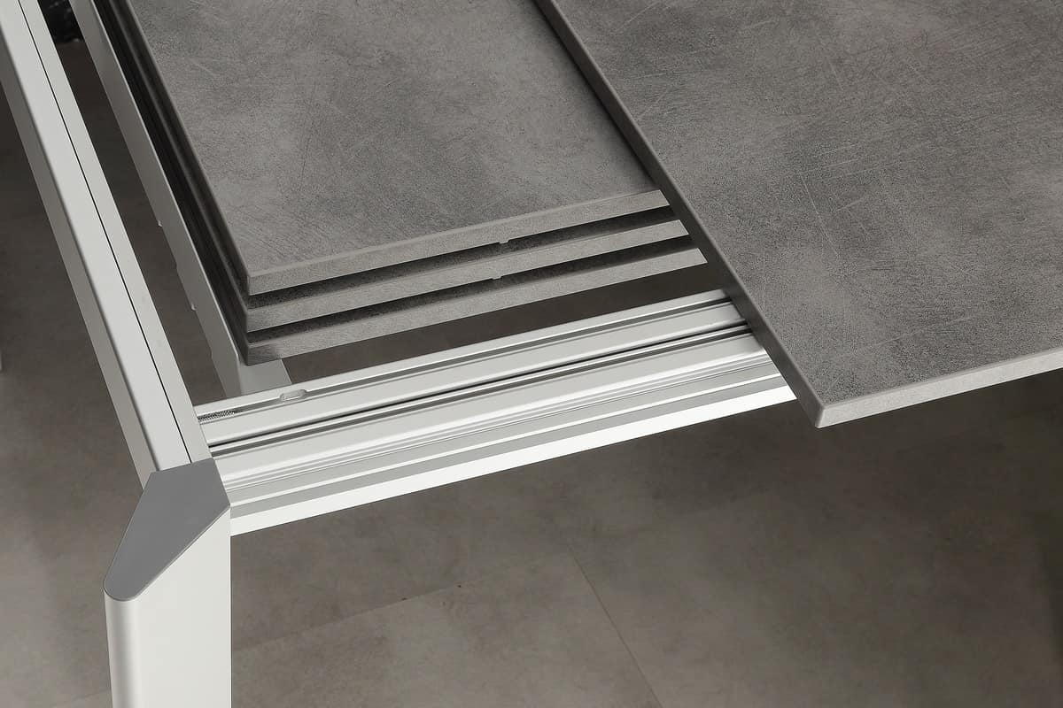 Tavolo telescopico allungabile con allunga telescopica, senza gambe in mezzo. Tavolo con struttura in alluminio anodizzato o verniciato bianco, dotato di piano in nobilitato bianco (bordo ABS).