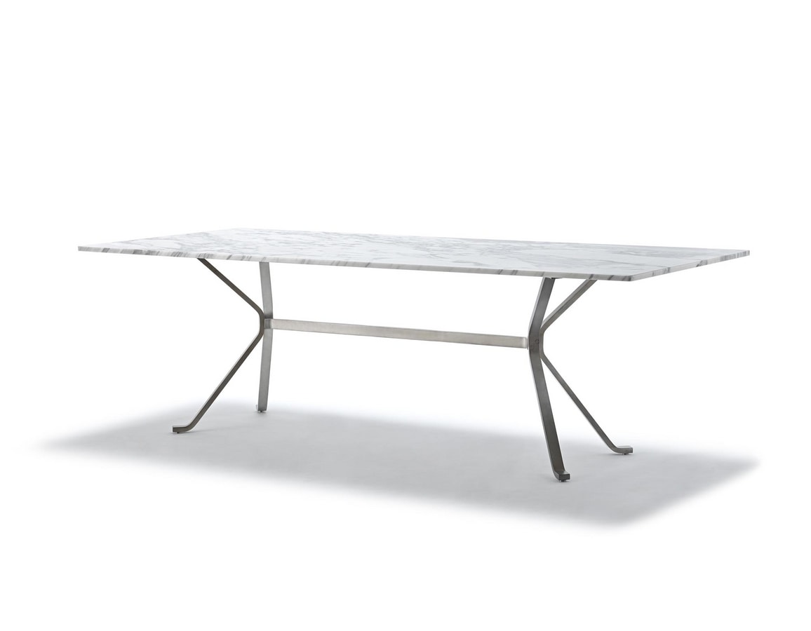 Crab nella versione rettangolare. Il piano in marmo arabescato con la base in acciaio, trattato con finitura peltro, rendono questo tavolo forte, equilibrato ed armonico. Un’eleganza non ostentata ma sobria e di stile.