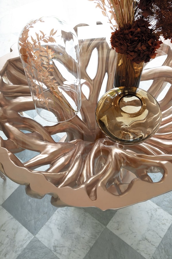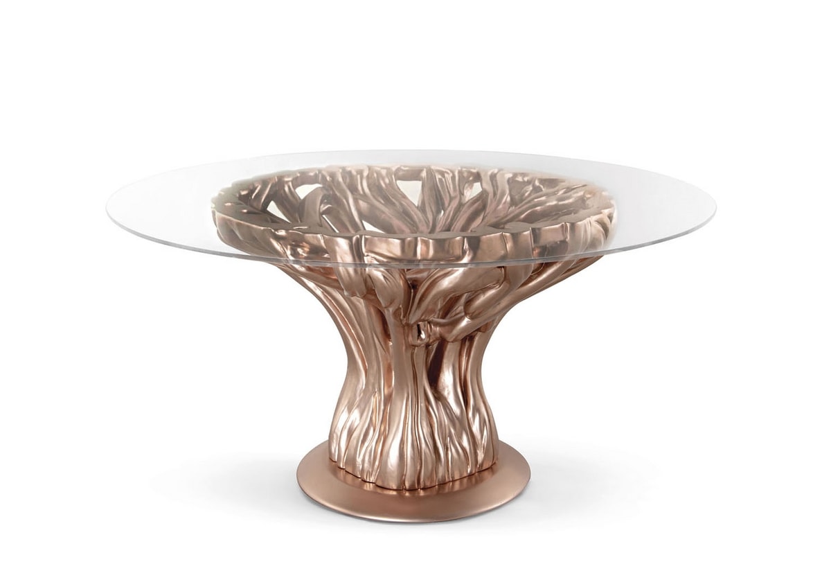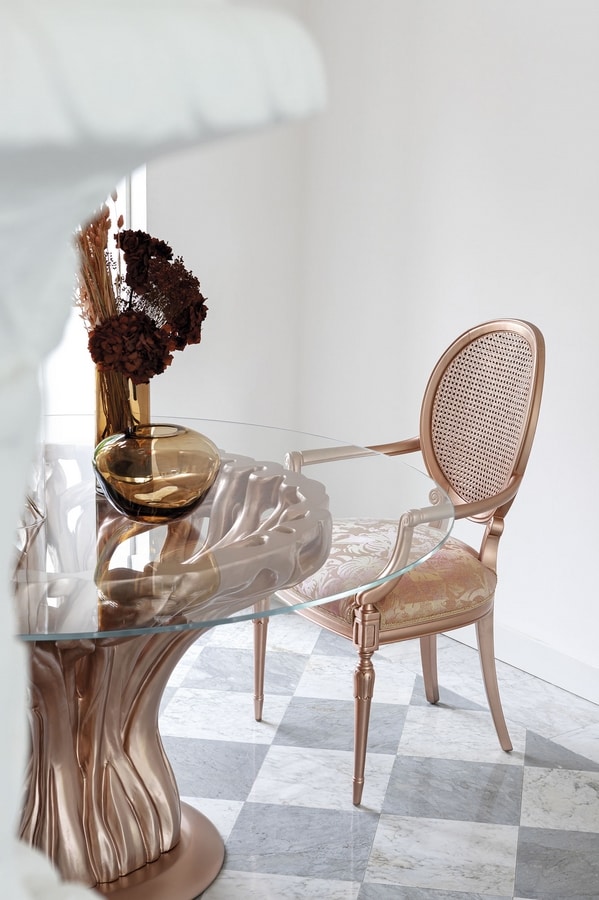 Tavolo rotondo intagliato in massello di tiglio, finitura laccata colore sakura con effetto metallizzato opaco, piano in cristallo trasparente.