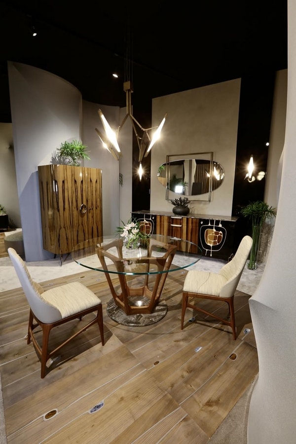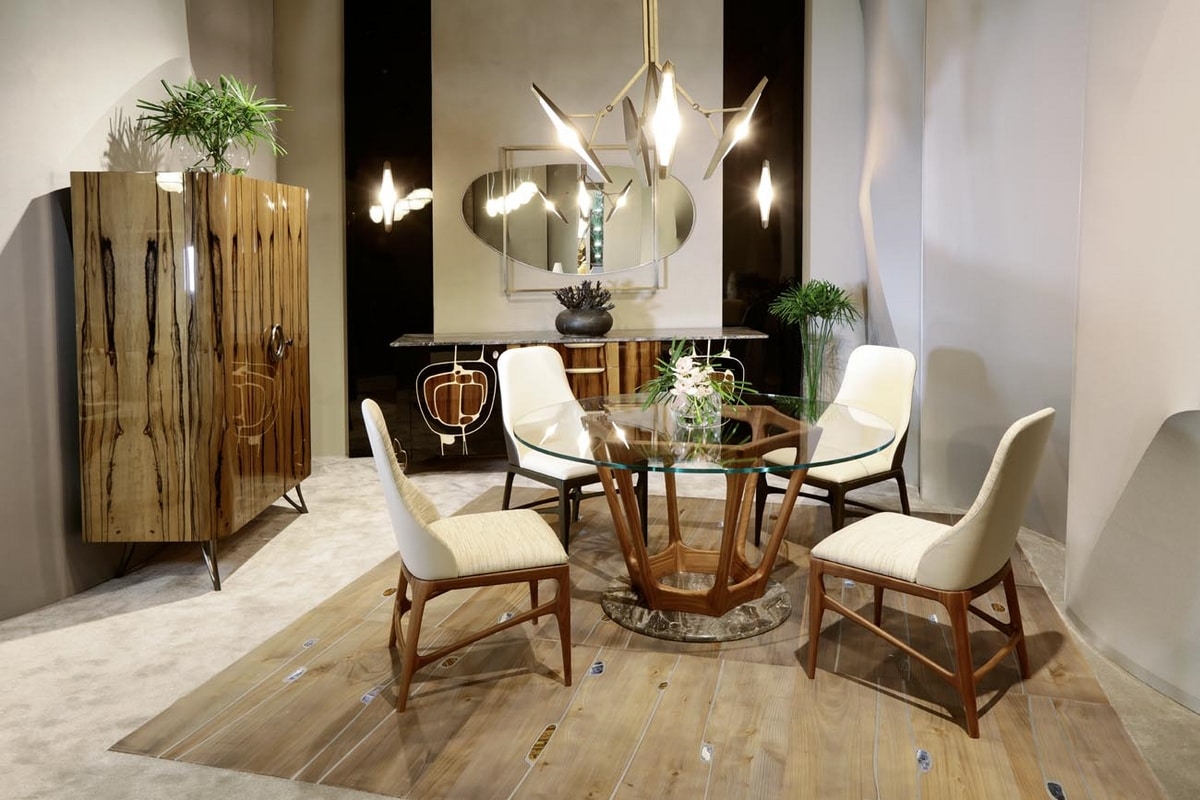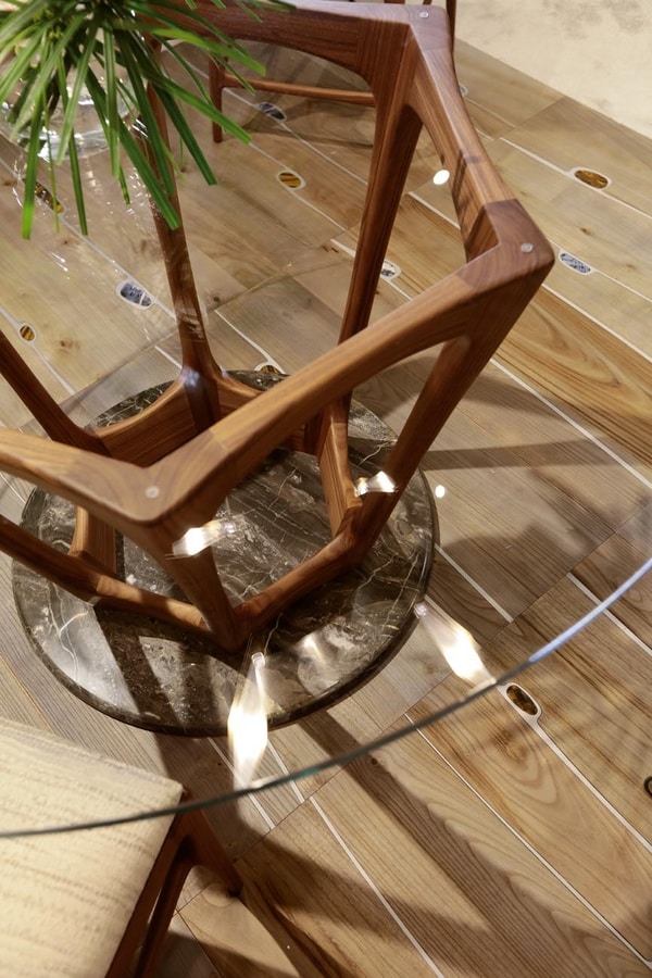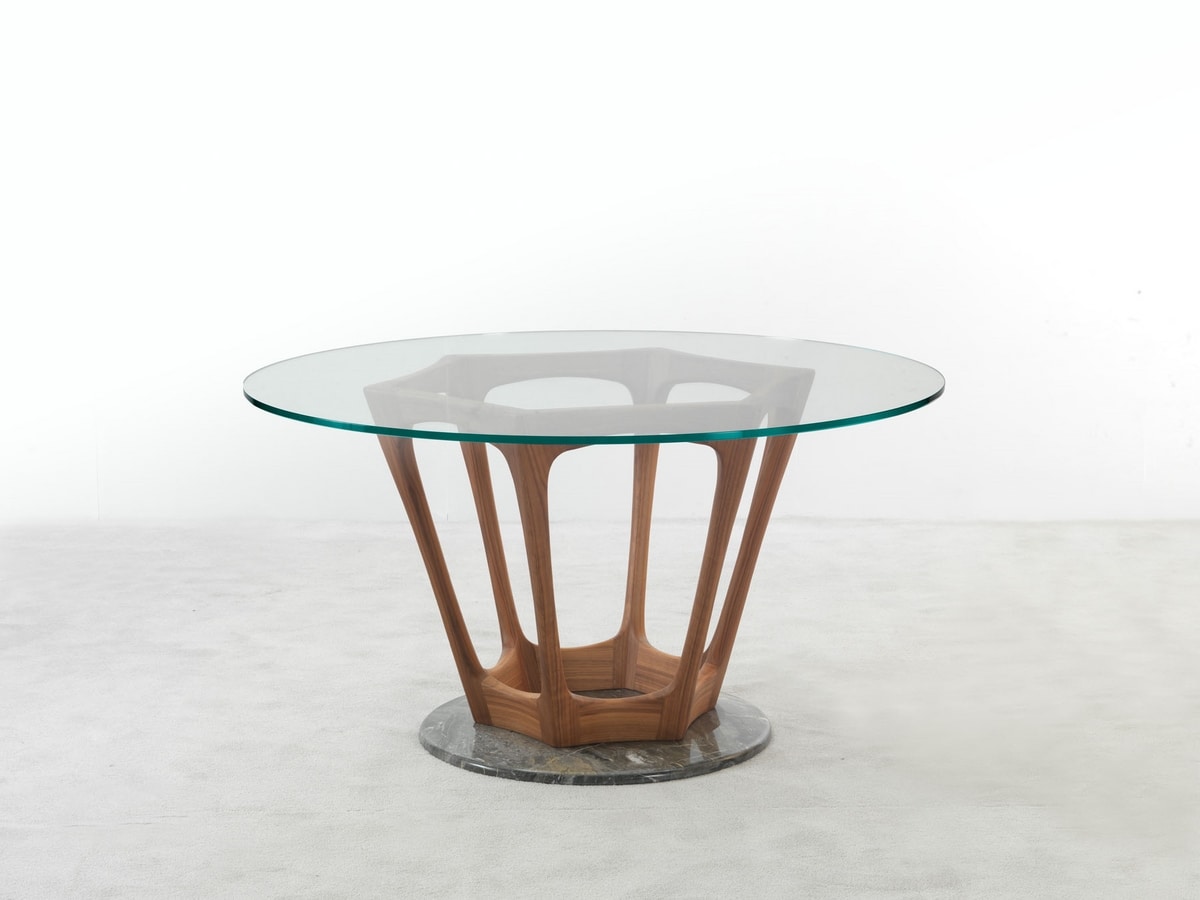 Noce Canaletto poggiata su una lastra rotonda in marmo Arabescato Orobico. La base è visibile dal piano in cristallo rotondo. Questo tavolo fa parte della collezione Gea, interamente caratterizzata da forme particolari e dall'uso di diversi materiali pregiati.