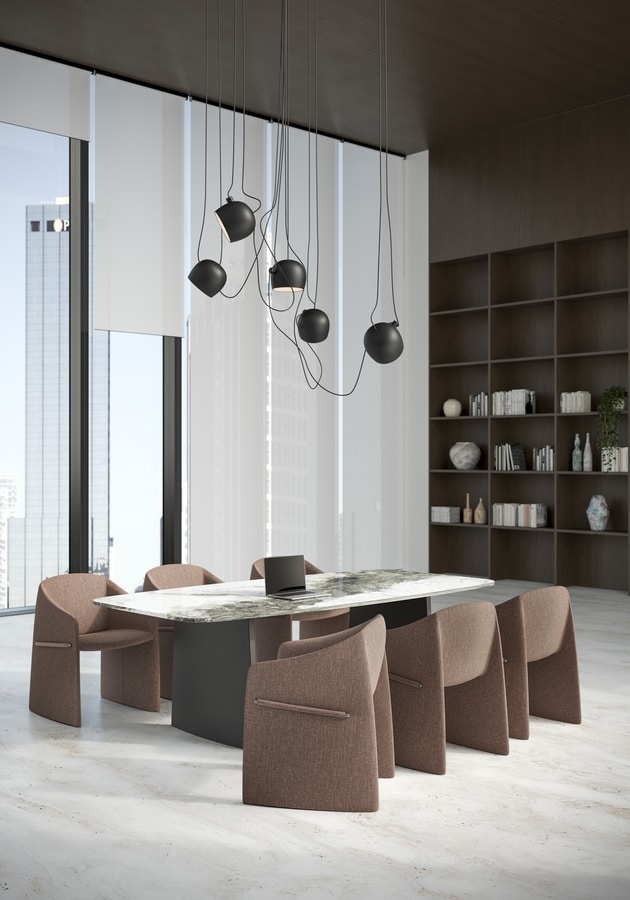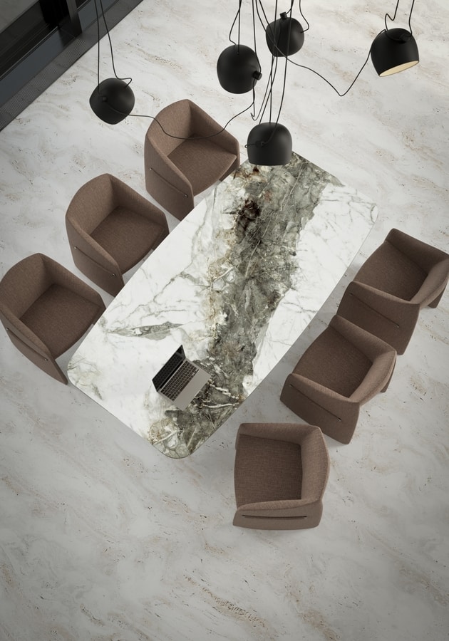 La collezione Twirli incarna l’equilibrio perfetto tra materiali pregiati e design sofisticato. Il tavolo si distingue per la base rivestita in pelle, che aggiunge un tocco di raffinatezza tattile, e il piano in vetro serigrafato, che dona leggerezza e luminosità all’insieme. Pensato per ambienti esclusivi dell’hospitality, Twirli combina estetica e funzionalità, trasformando ogni spazio in un’esperienza di design senza tempo.