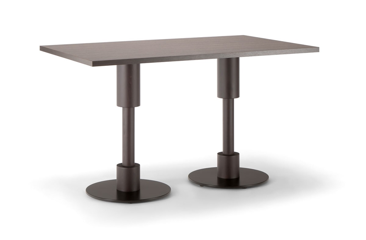 Tavoli in legno massello, dalle linee raffinate e moderne. Adatto per arricchire hotel e ristoranti di lusso. Il piano del tavolo è disponibile in legno impiallacciato faggio o in laminato. La base del tavolo è realizzata in legno massello con una piastra di fusione rivestita con una base in acciaio satinato o cromato.