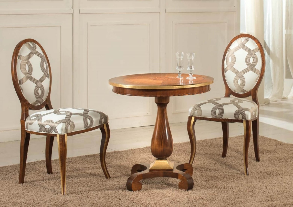 Tavolo in stile 800, in legno, con piano rotondo intarsiato.