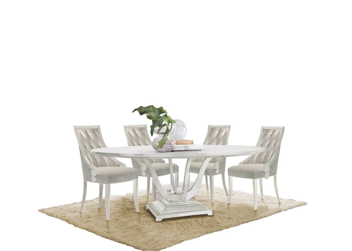 Tavolo da pranzo con piano tondo, su basamento.